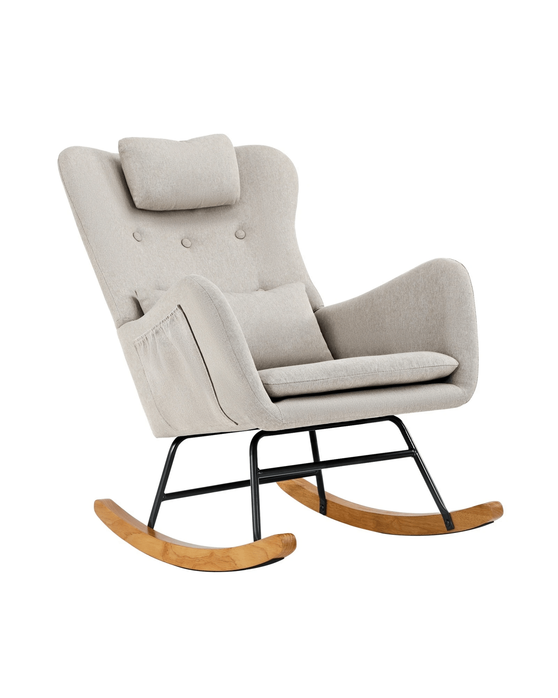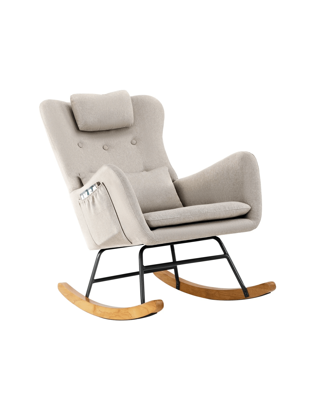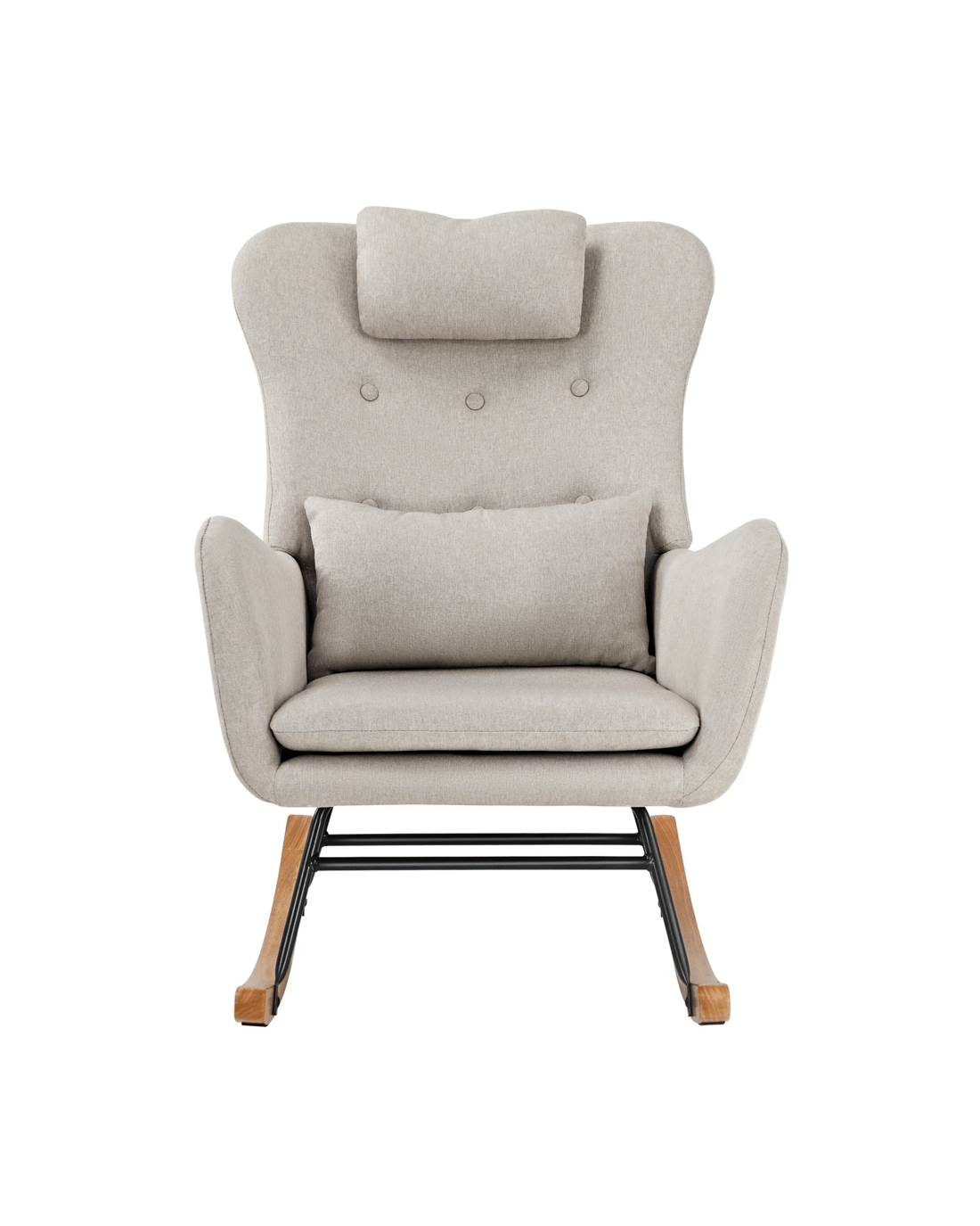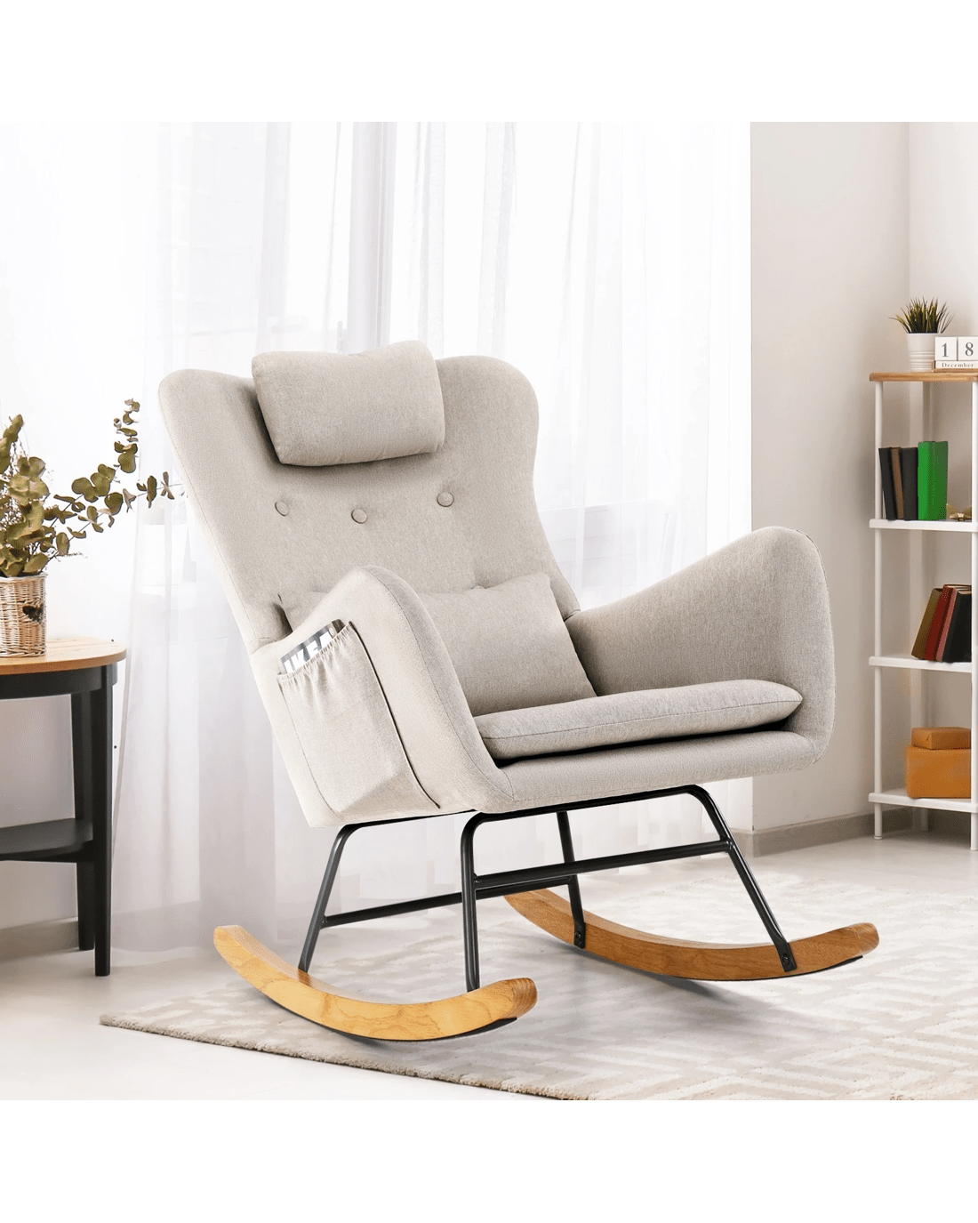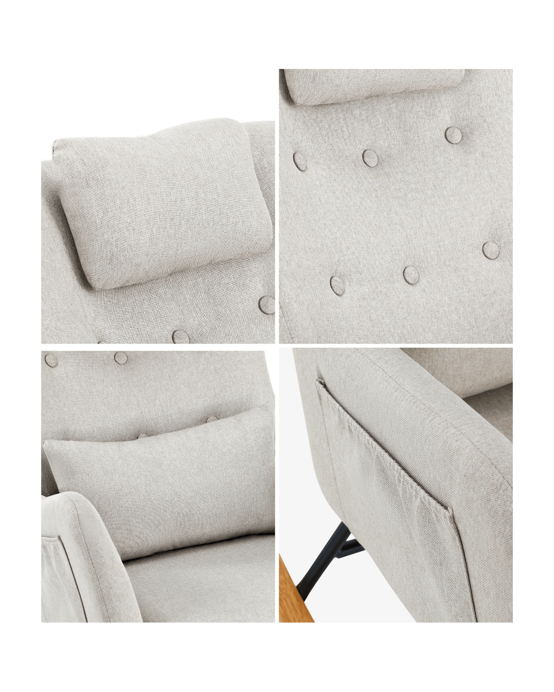Our rocking armchair is upholstered in high-quality faux linen fabric that emulates the look and feel of traditional linen while being easy to maintain. The soft and durable fabric adds a touch of sophistication to your home. Sink into the plush, generously padded seat and backrest, and enjoy a comfortable and supportive seating experience. The included headrest and bolster pillow cradle your head and lower back, providing added comfort and relaxation as you rock gently.