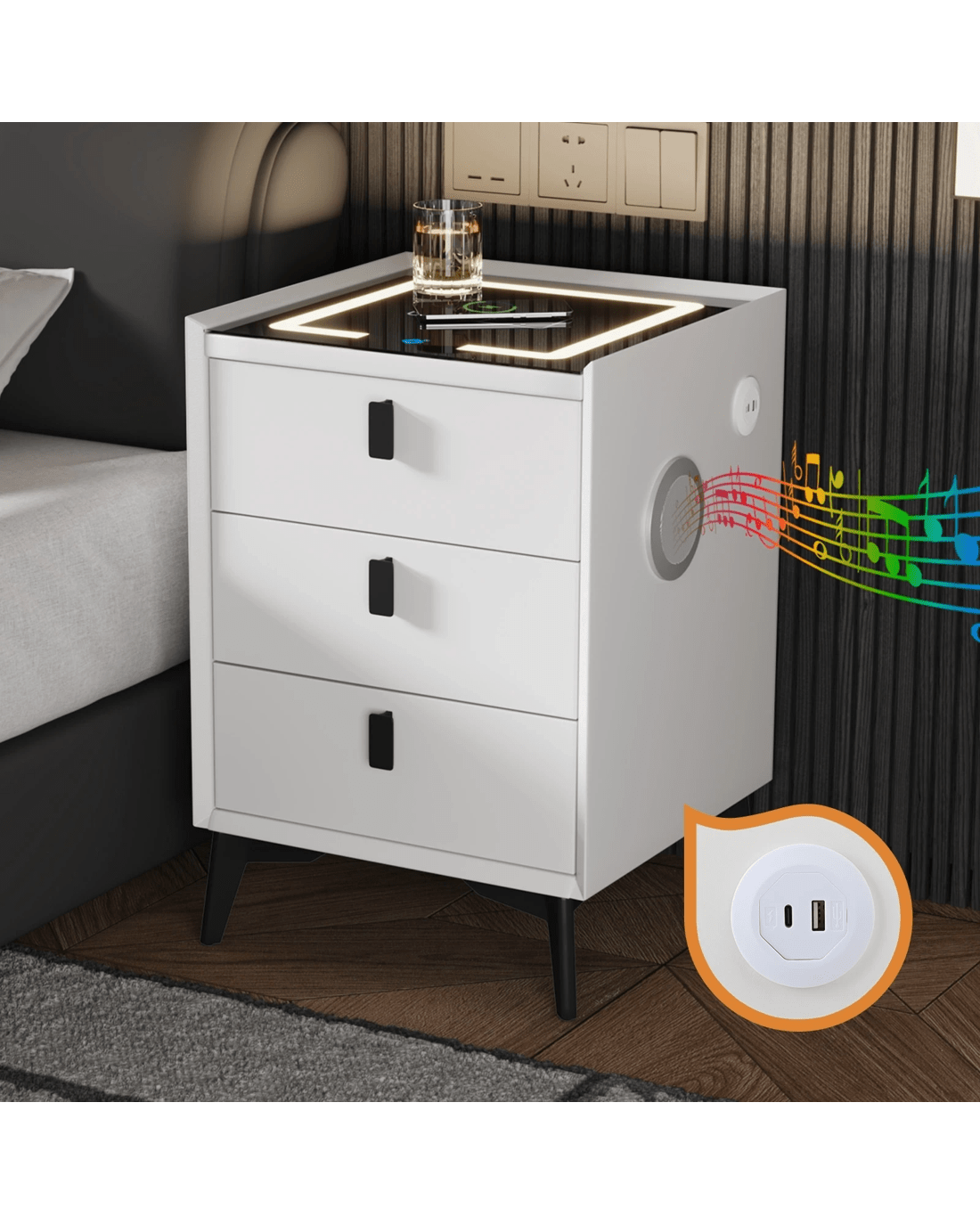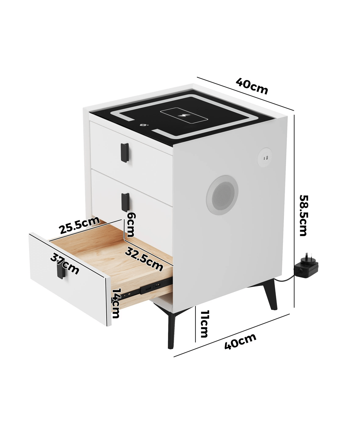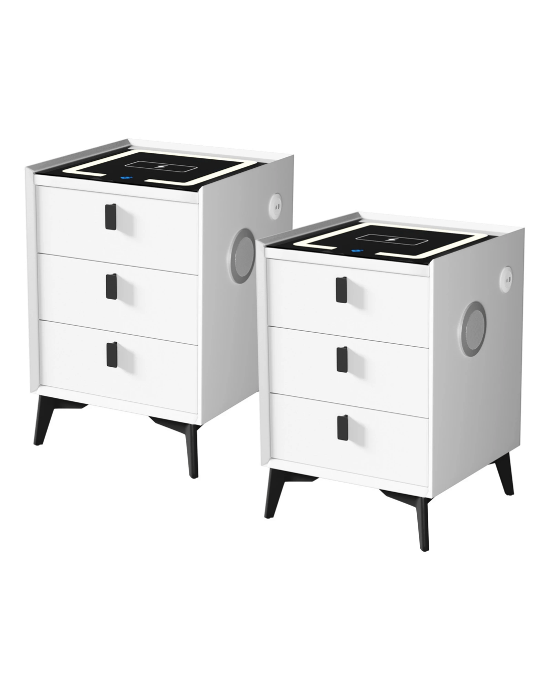 Sold by Kamprad's Oikos 1943Oikiture Set of 2 Smart Bedside Tables Wireless Charging LED 3 Drawer Nightstand - White