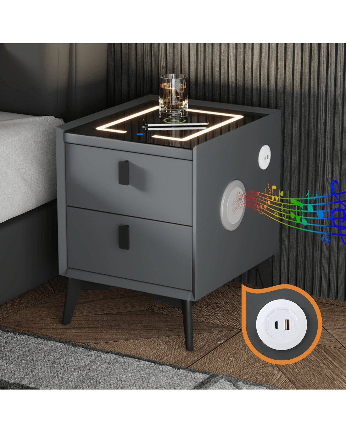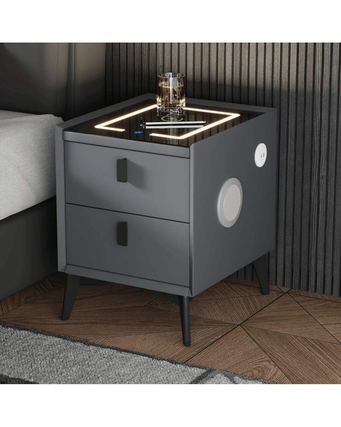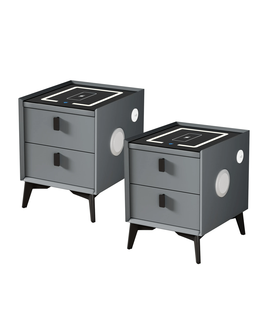 Oikiture Set of 2 Smart Bedside Tables Wireless Charging LED Nightstand Drawers - Grey