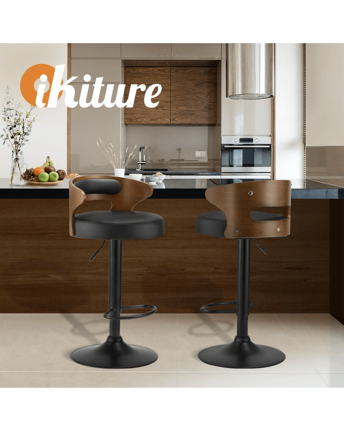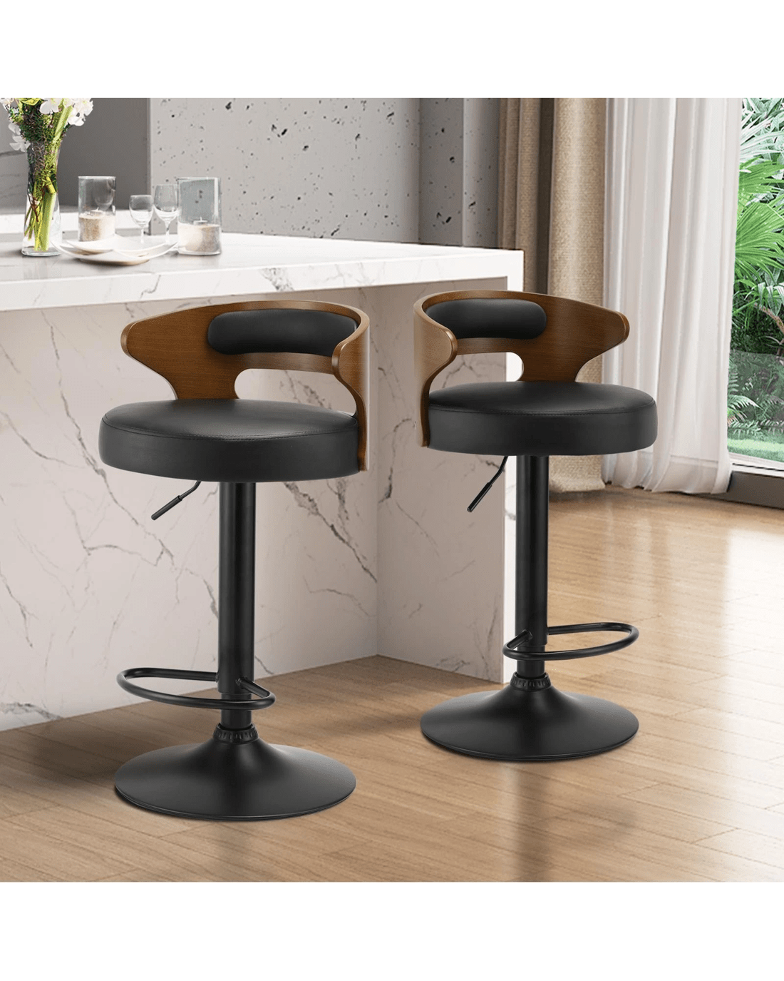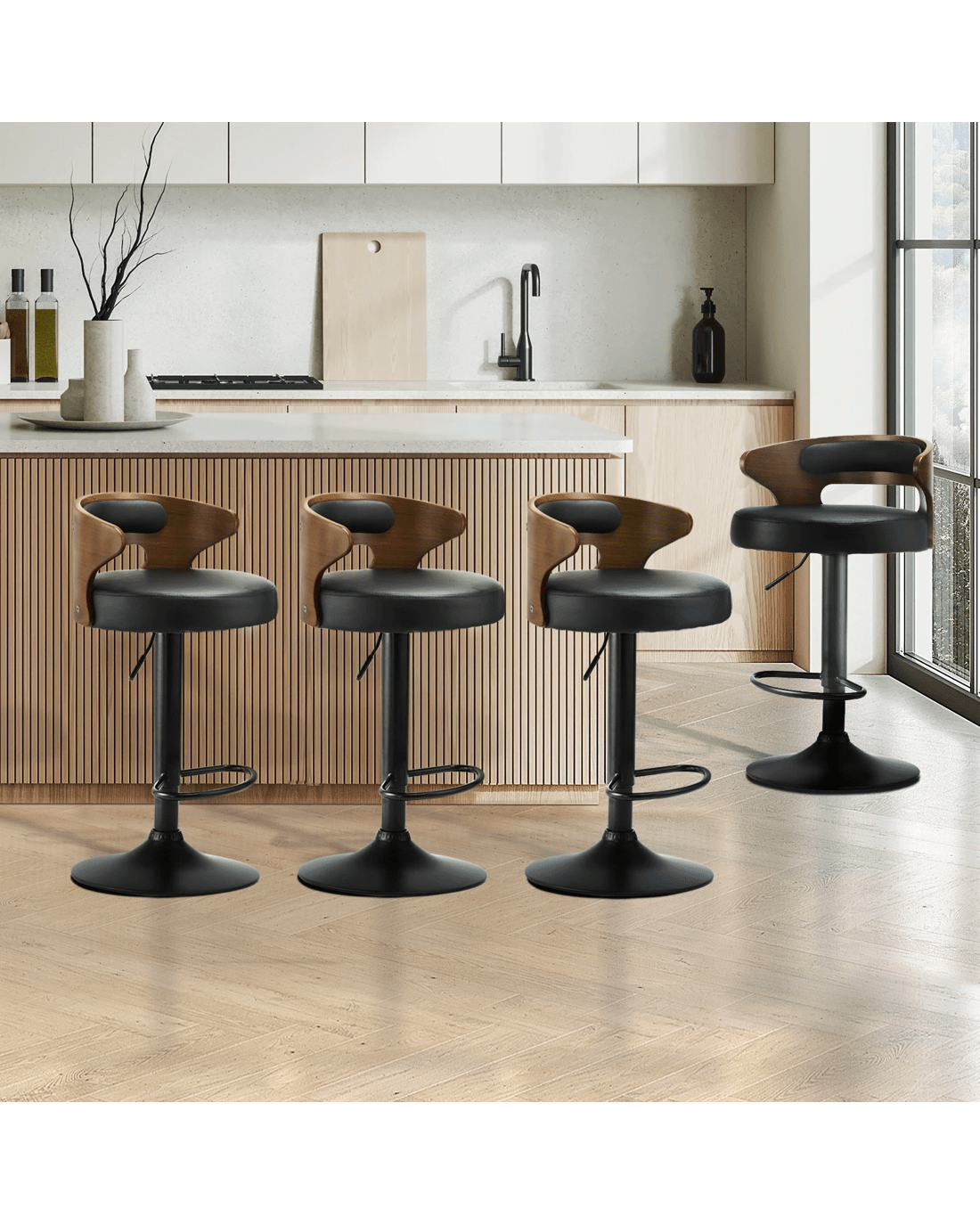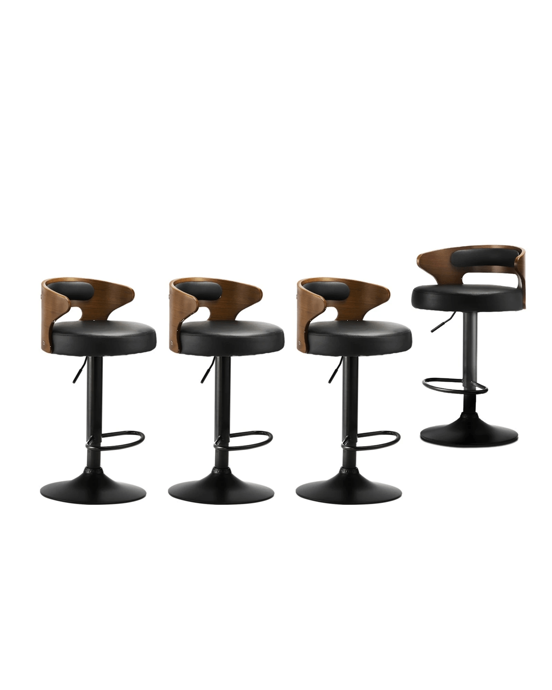 Oikiture Set Of 4 Bar Stools Kitchen Gas Lift Swivel Chairs Wooden Barstool - Black