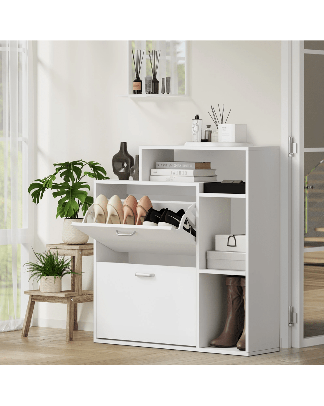 Conveniently built into the side of the shoe storage cabinet is a multi-level display shelf that offers more storage or display area that deems fit for your purpose. Just perfect to showcase your treasure mementos, collectibles or even potted plants to add more natural vibes to the entire ensemble.