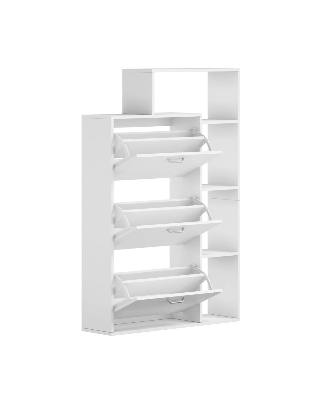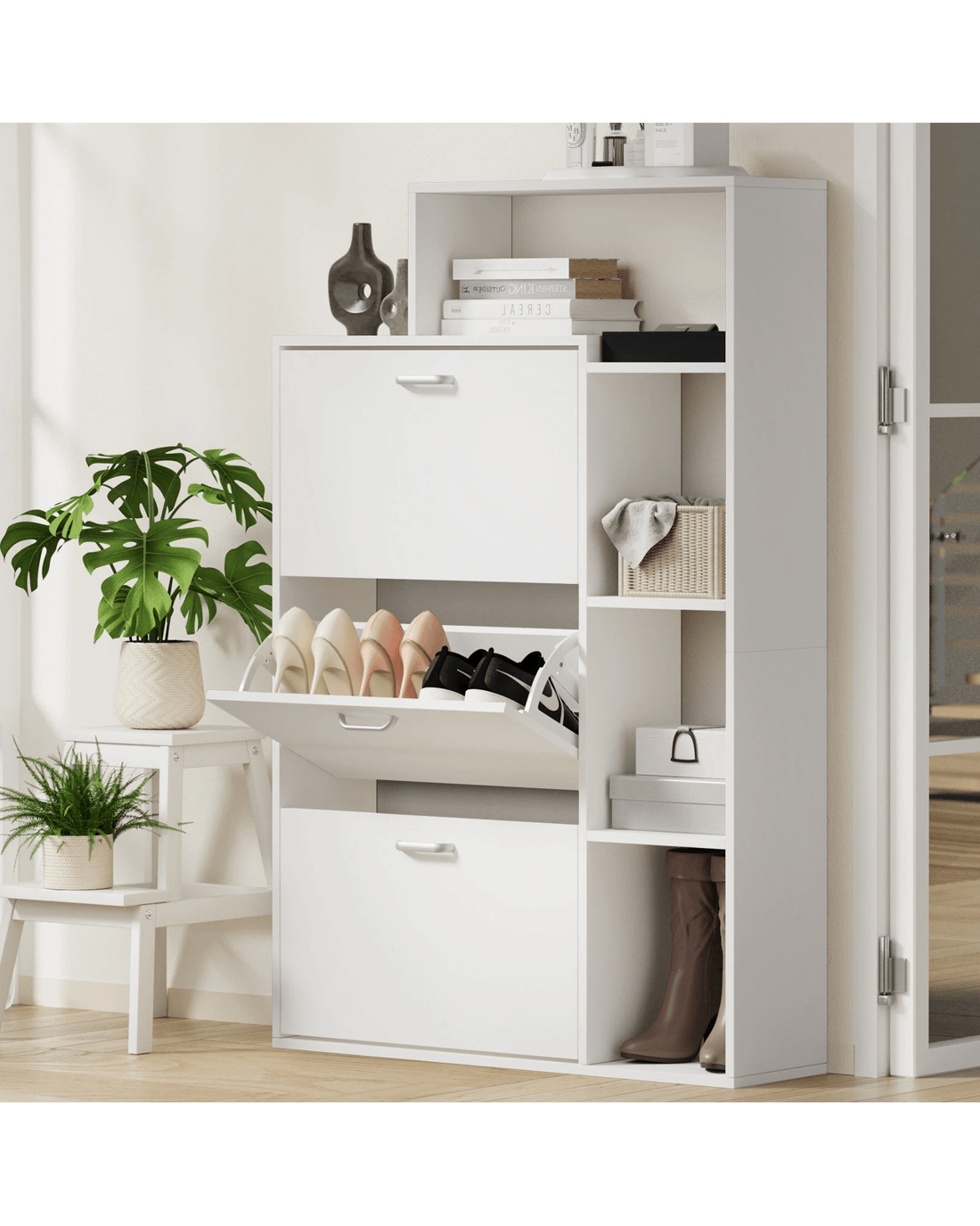 Conveniently built into the side of the shoe storage cabinet is a multi-level display shelf that offers more storage or display area that deems fit for your purpose. Just perfect to showcase your treasure mementos, collectibles or even potted plants to add more natural vibes to the entire ensemble.