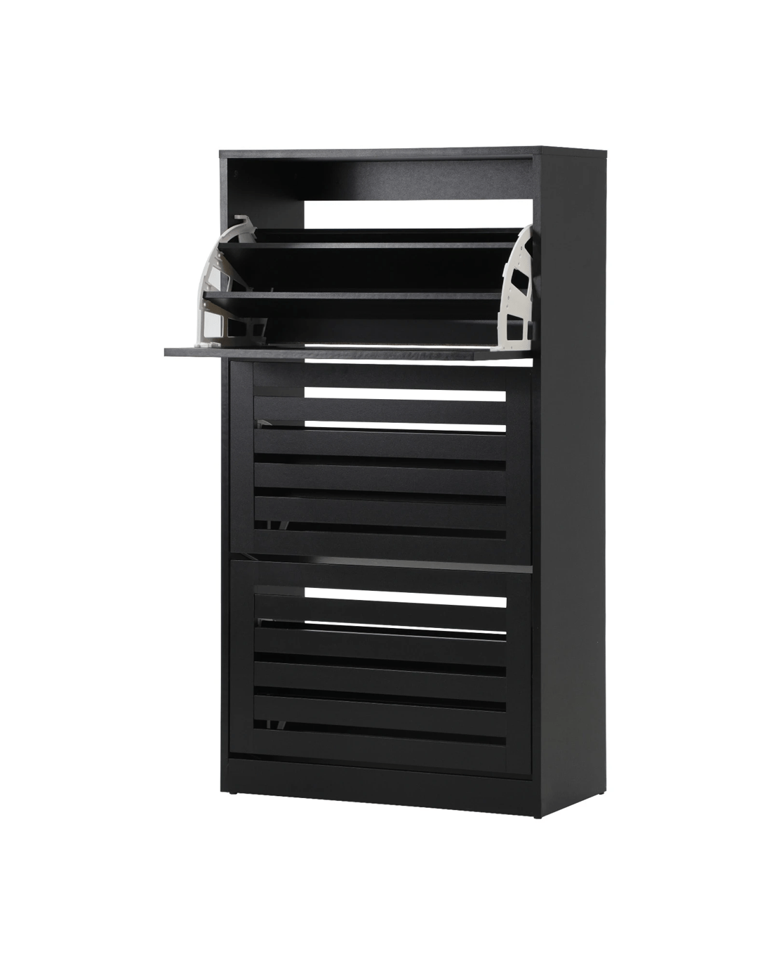 Inside, the Three storage compartments come with three rows per compartment and of which each row can be adjusted for shoe type. Store up to 45 pairs of ladies or children footwear or 18 pairs of men shoes. And on top, the cabinet provides a nice display space for your favourite items and collectibles too.