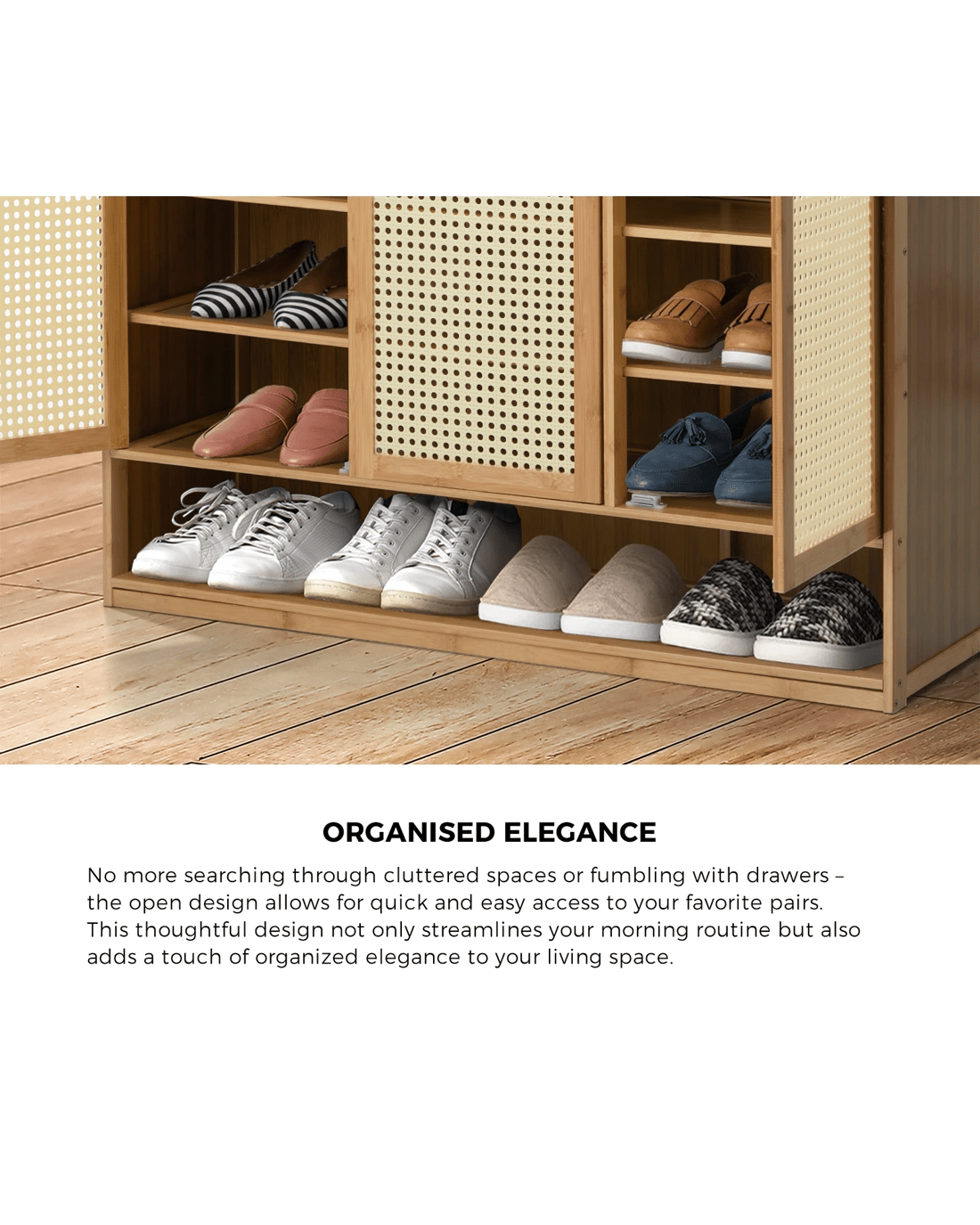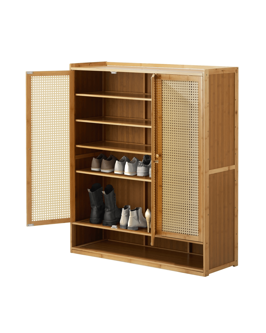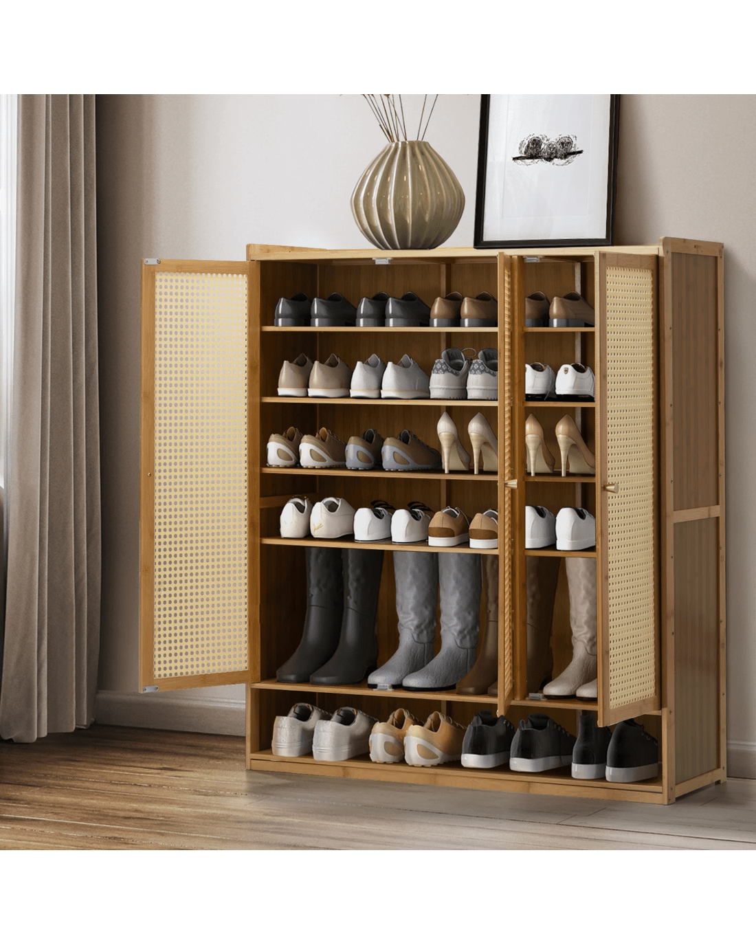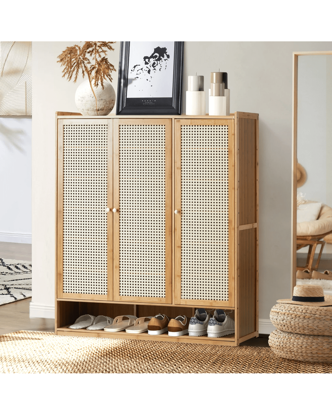 Crafted with precision, this shoe storage solution not only prioritizes organization but also elevates your space with its contemporary design. The combination of rattan doors and multiple compartments makes this cabinet a stylish and functional addition to any entryway or bedroom. Bring order to your footwear ensemble with our Oikiture Shoe Storage Cabinet - where convenience meets chic storage.