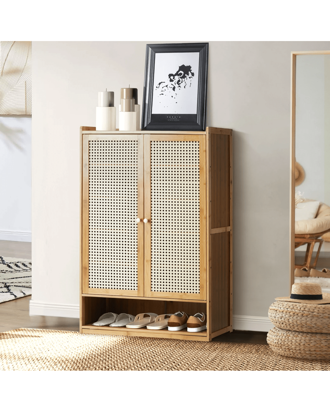 Oikiture Shoe Storage Cabinet Shoes Rack Organiser Shelf 2 Doors Rattan - Natural