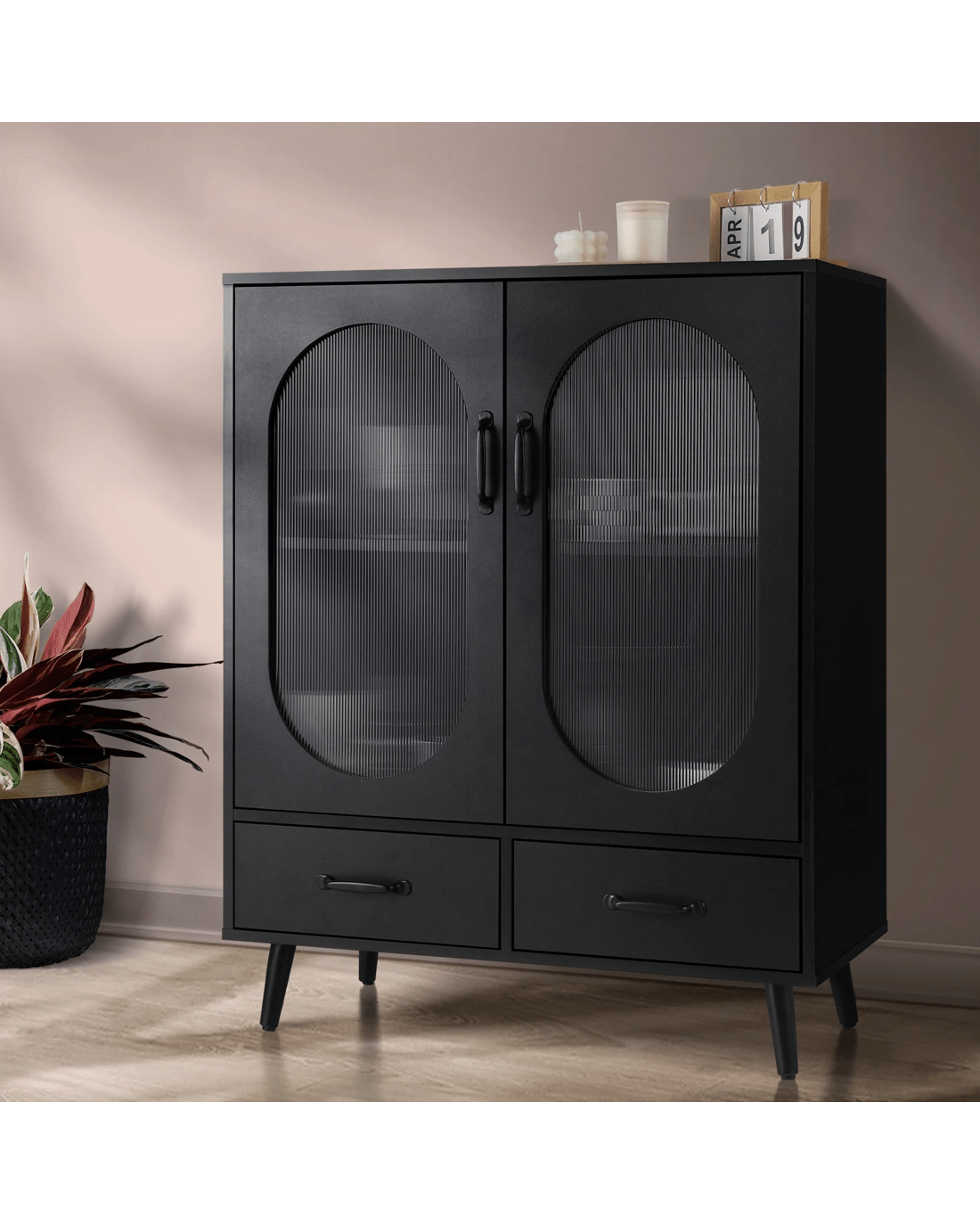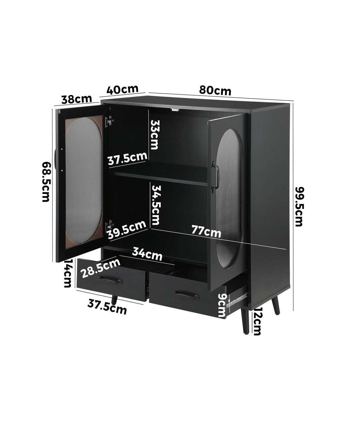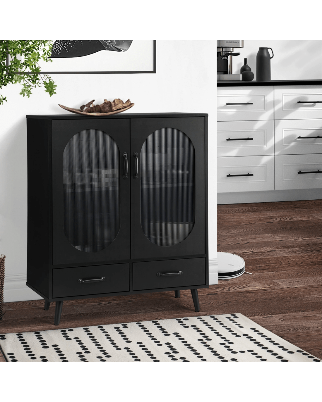 Introducing Oikiture coal black range, this sideboard is the perfect piece to spice up your hallway or bedroom. It has a simple design but crafted with practicality in mind - tuck away your bits and pieces in the storage shelves and two fluted door panels that gives it a sleek look.