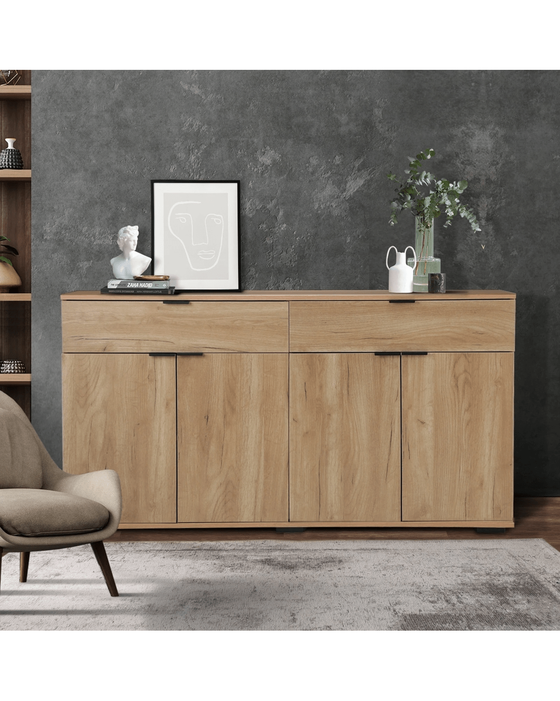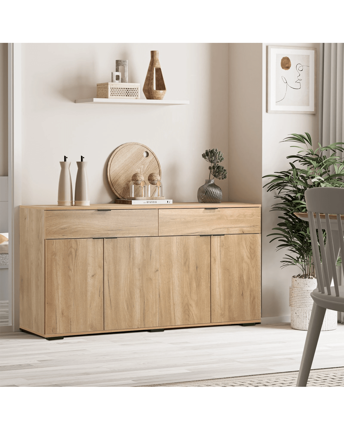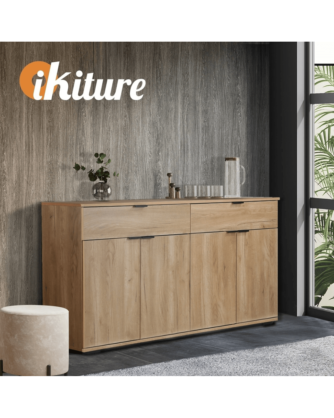 With a very practical and equally contemporary design, this Oikiture Sideboard features a clean profile in chic blanc that speaks volumes of its sophisticated presence in any discerning home setting. First impressions can designed to captivate and this sideboard certainly does that perfectly with its generous display and storage space. Comprising two large top drawers and a 4-door cabinet with tiered shelving, the sideboard presents cavernous storage and has more than ample real estate to store household essentials and then some more. The top is long and linear and makes for a great storytelling platform in terms of your favourite photographic displays and other collectibles that ignite your passion and interests.