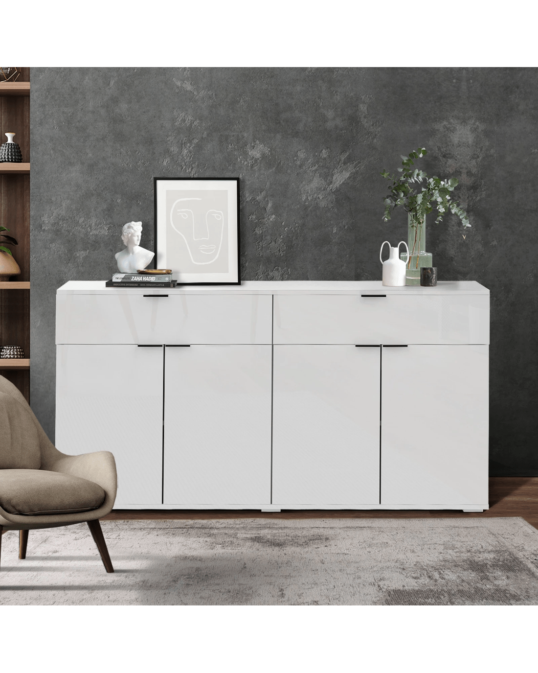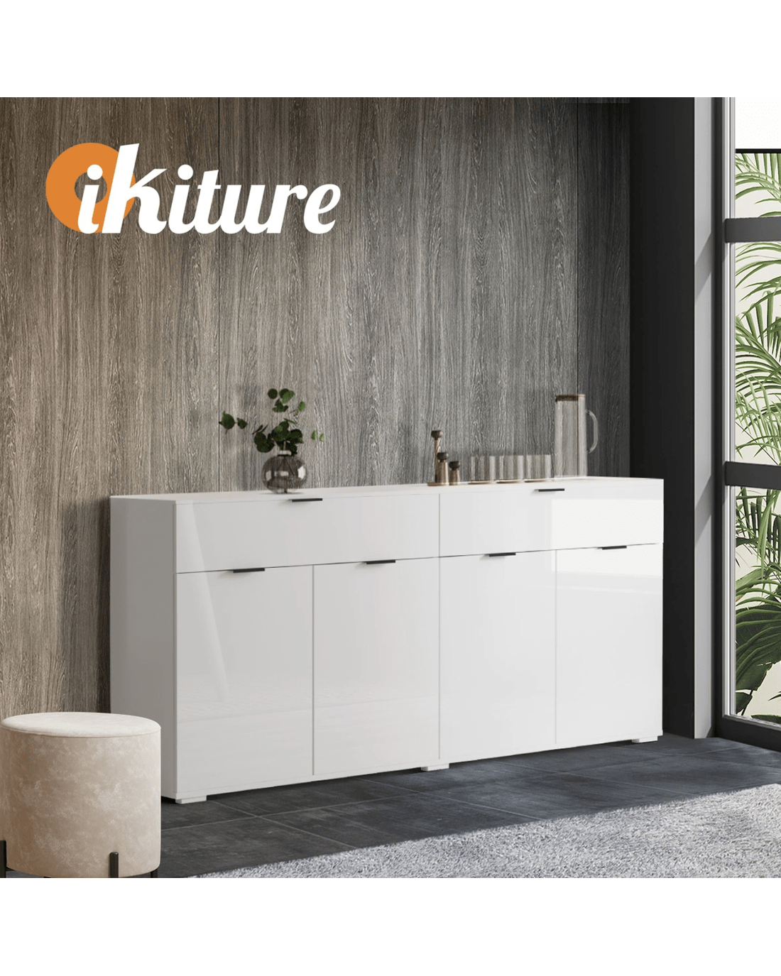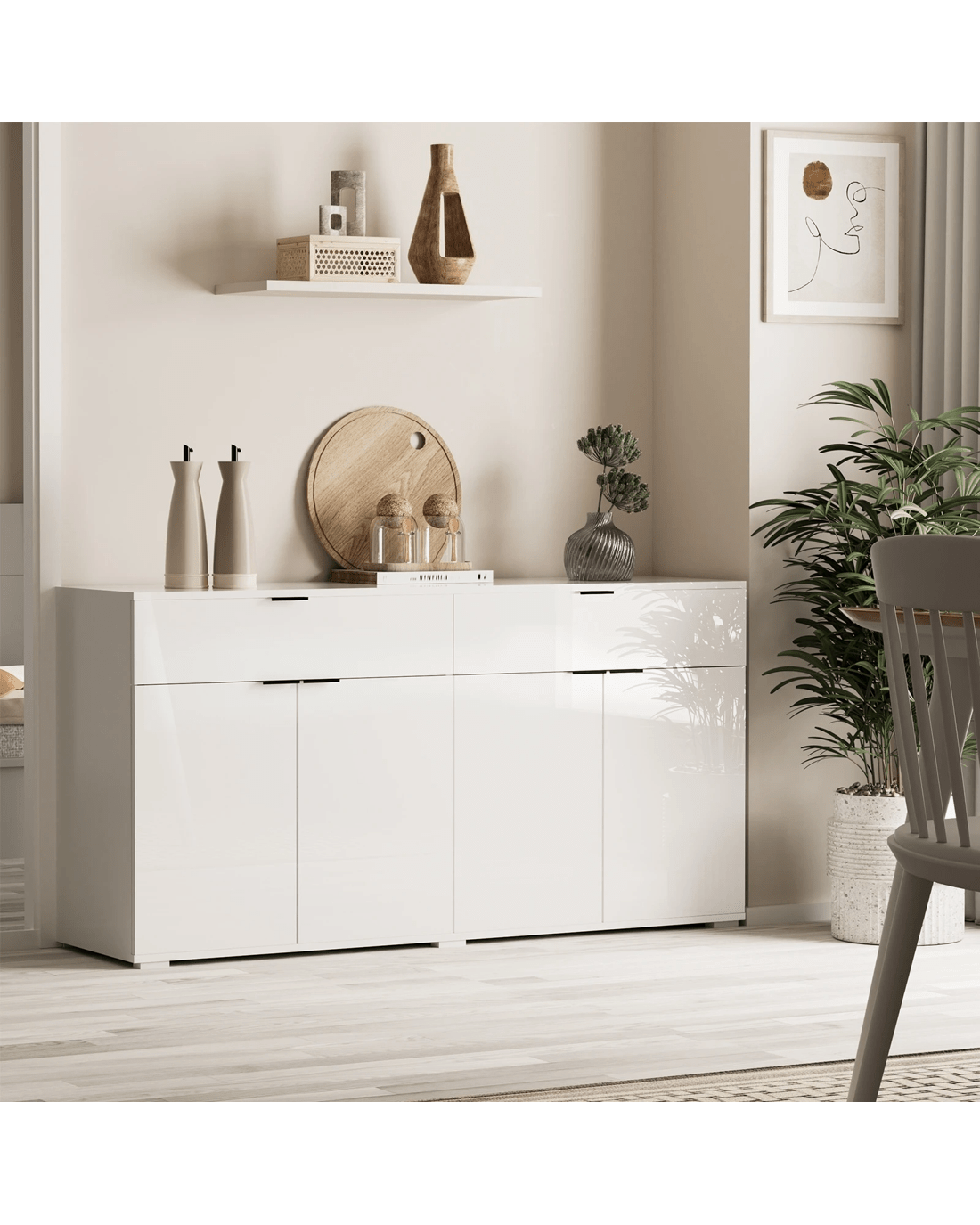 With a very practical and equally contemporary design, this Oikiture Sideboard features a clean profile in chic blanc that speaks volumes of its sophisticated presence in any discerning home setting. First impressions can designed to captivate and this sideboard certainly does that perfectly with its generous display and storage space. Comprising two large top drawers and a 4-door cabinet with tiered shelving, the sideboard presents cavernous storage and has more than ample real estate to store household essentials and then some more. The top is long and linear and makes for a great storytelling platform in terms of your favourite photographic displays and other collectibles that ignite your passion and interests.
