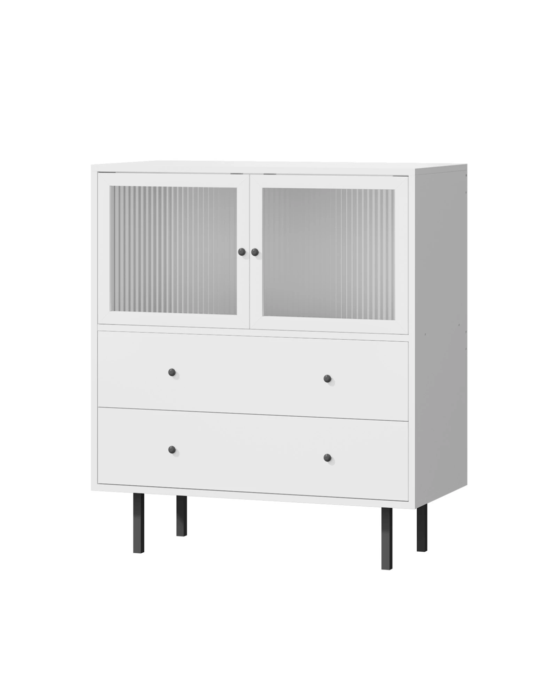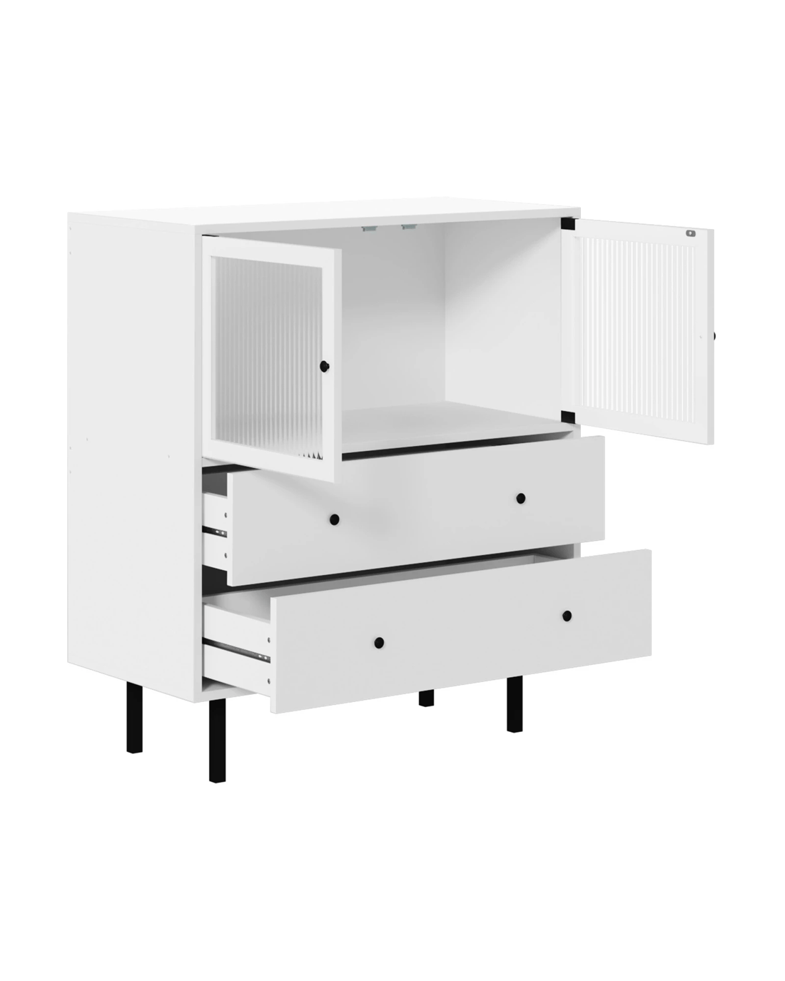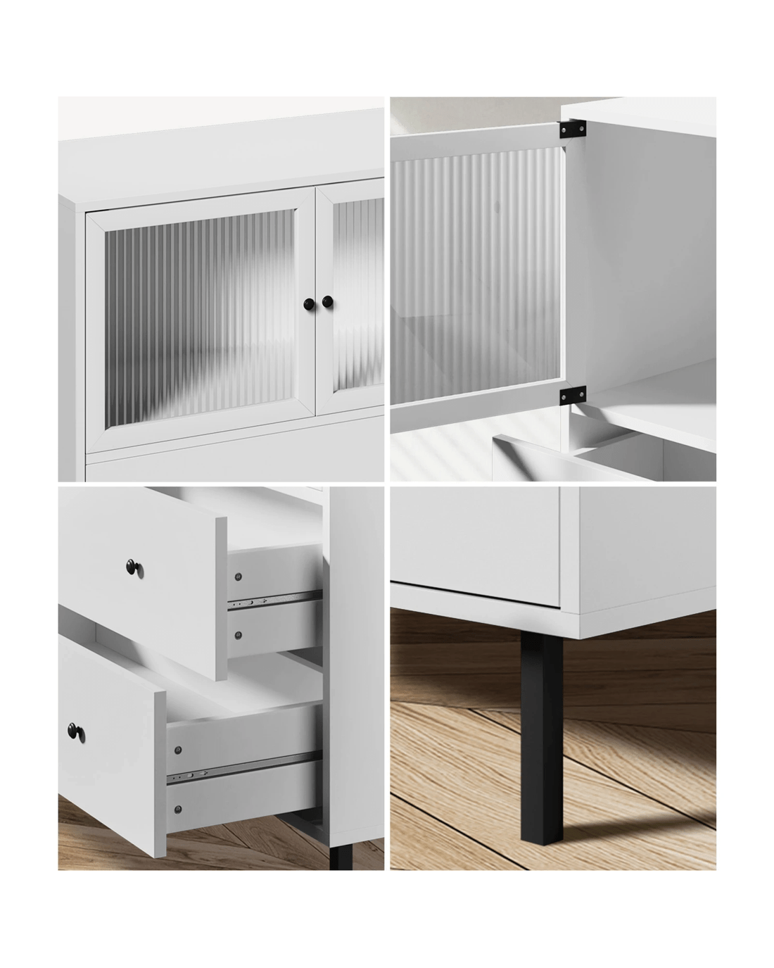 On top, a cavernous storage cabinet with two tempered-glass doors and aluminium alloy door handles ensure hassle-free effortless opening and closing. And definitely no problems with keeping and retrieving large items too. And just beneath it, another two large pull-out drawers with twin handles on each drawer, assisted by smooth powder-coated metal runners, make using them a breeze and never a chore, especially when laden with a generous amount of storage items. More display space on the top surface of the sideboard allows this versatile item to be used in a variety of d篓娄cor ideas throughout your home. Bedroom, study, living room or hallway. The choice is yours to detail.