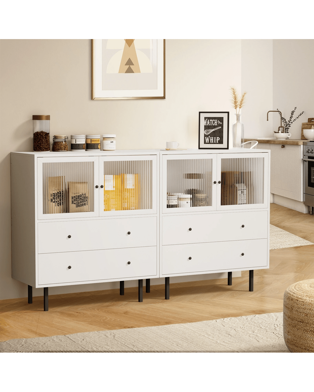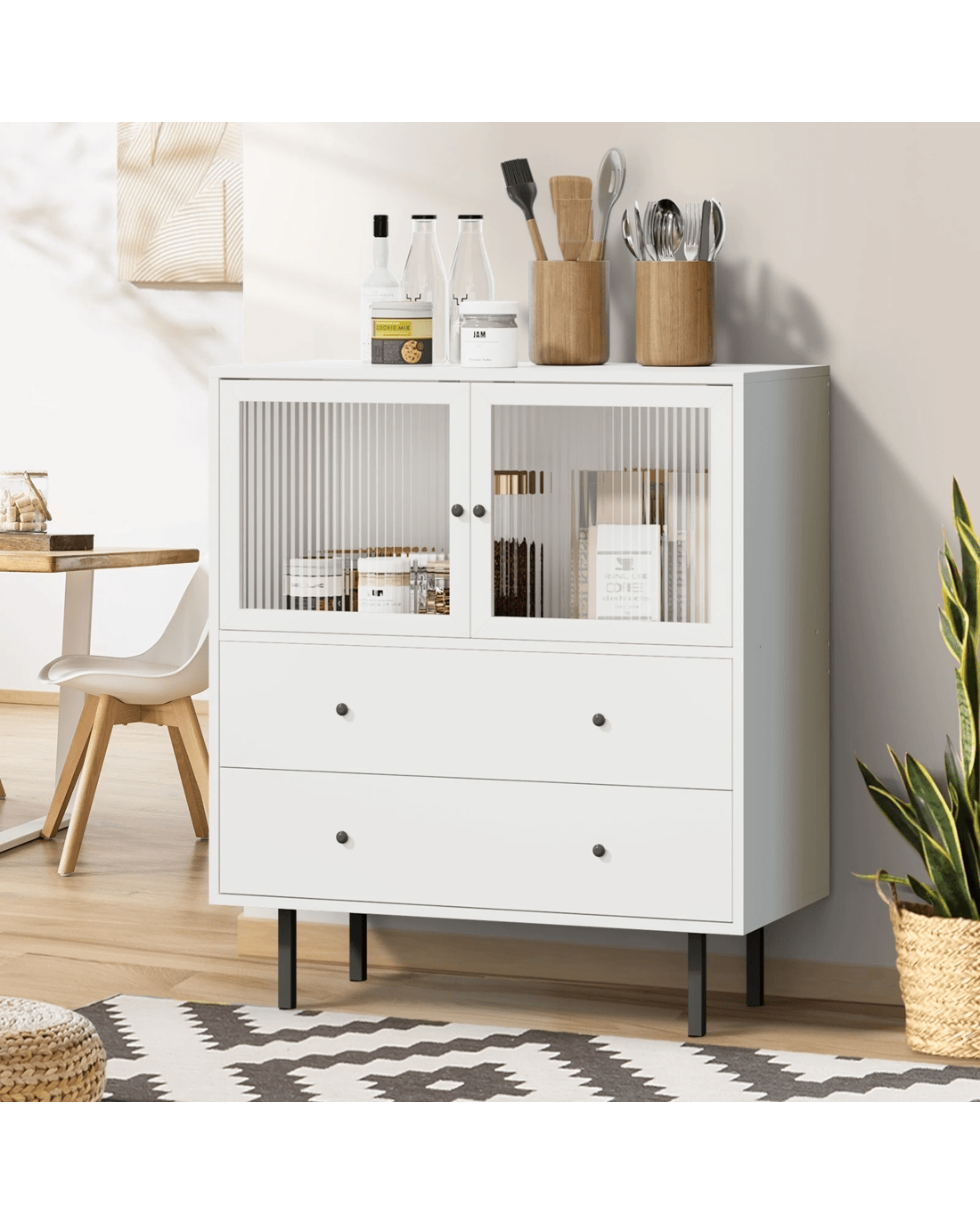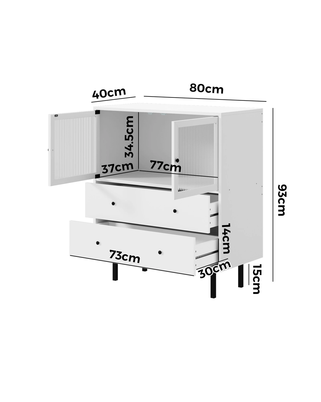 On top, a cavernous storage cabinet with two tempered-glass doors and aluminium alloy door handles ensure hassle-free effortless opening and closing. And definitely no problems with keeping and retrieving large items too. And just beneath it, another two large pull-out drawers with twin handles on each drawer, assisted by smooth powder-coated metal runners, make using them a breeze and never a chore, especially when laden with a generous amount of storage items. More display space on the top surface of the sideboard allows this versatile item to be used in a variety of d篓娄cor ideas throughout your home. Bedroom, study, living room or hallway. The choice is yours to detail.