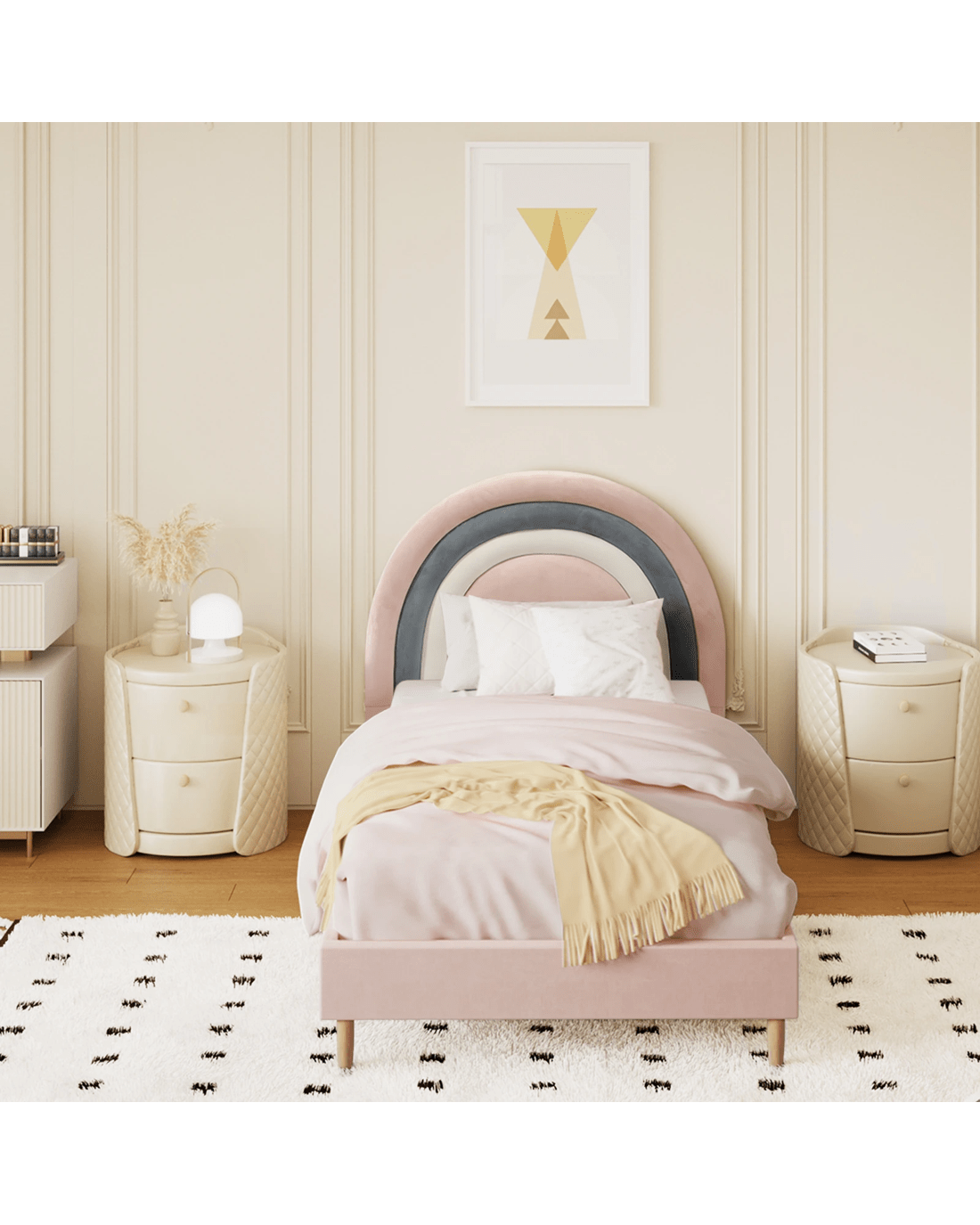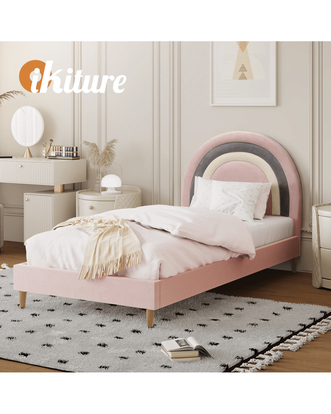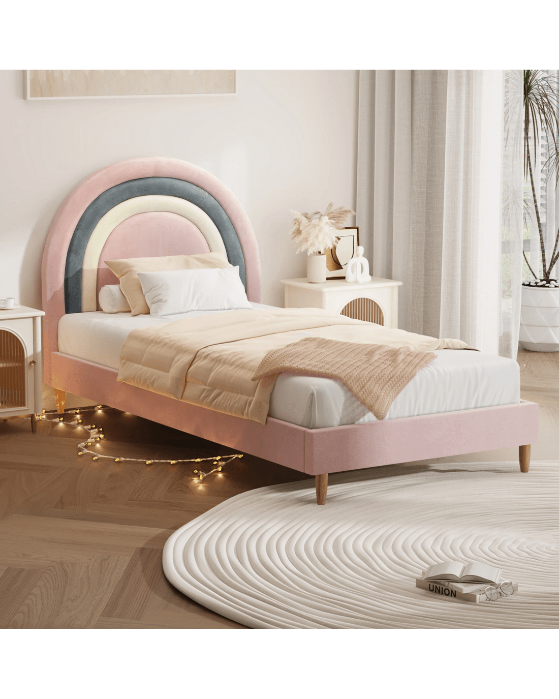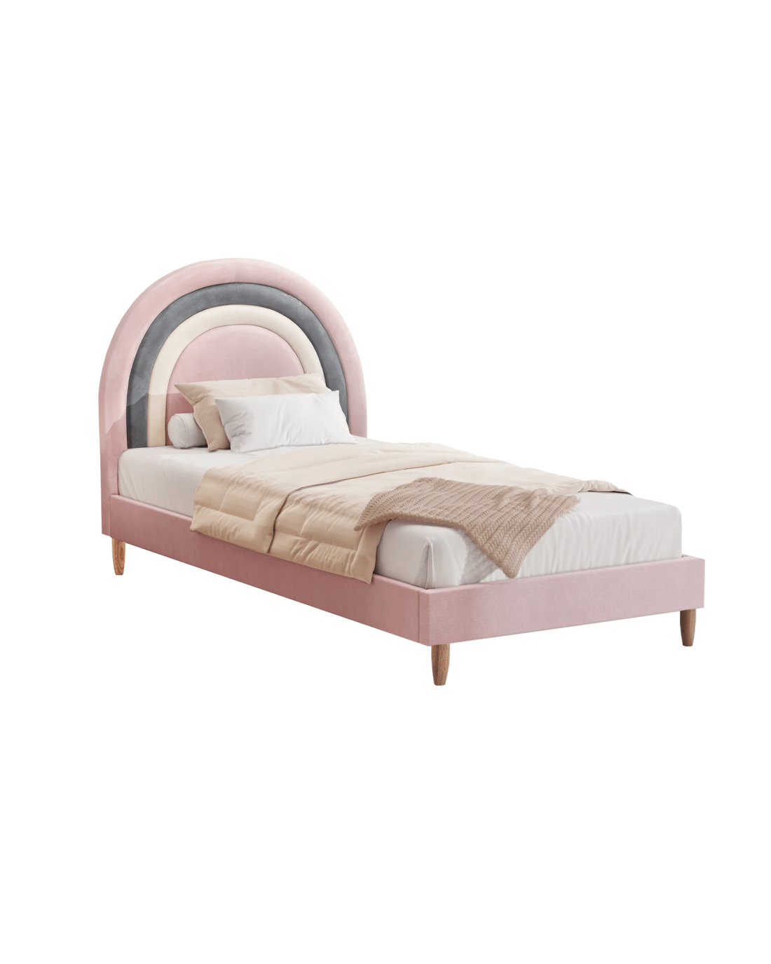 Oikiture Single Bed Frame Rainbow Kids Bed Base Velvet - Pink