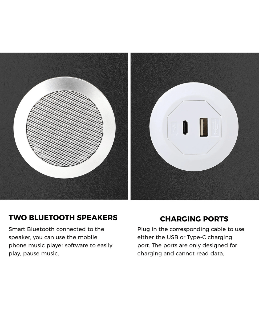 Need to charge or power up your media devices? A built-in wireless charging pad plus a USB-A and USB-C charging port are right there at your beckoning. Better still, the two Bluetooth speakers provide even more music to your ears as you slumber the night away.