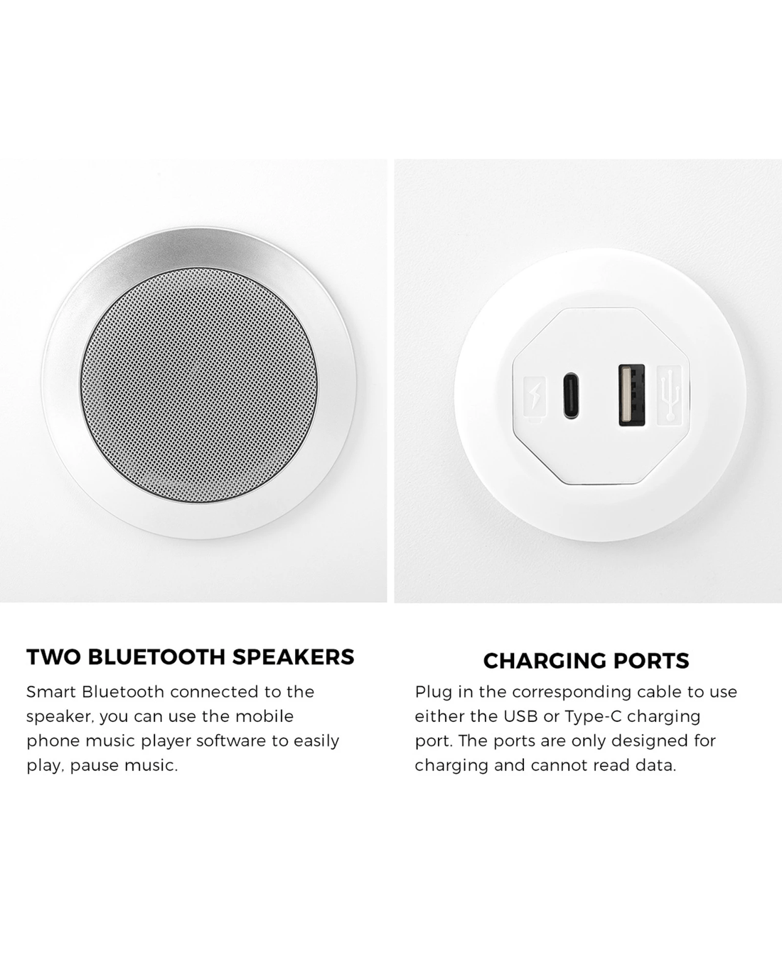 Need to charge or power up your media devices? A built-in wireless charging pad plus a USB-A and USB-C charging port are right there at your beckoning. Better still, the two Bluetooth speakers provide even more music to your ears as you slumber the night away.