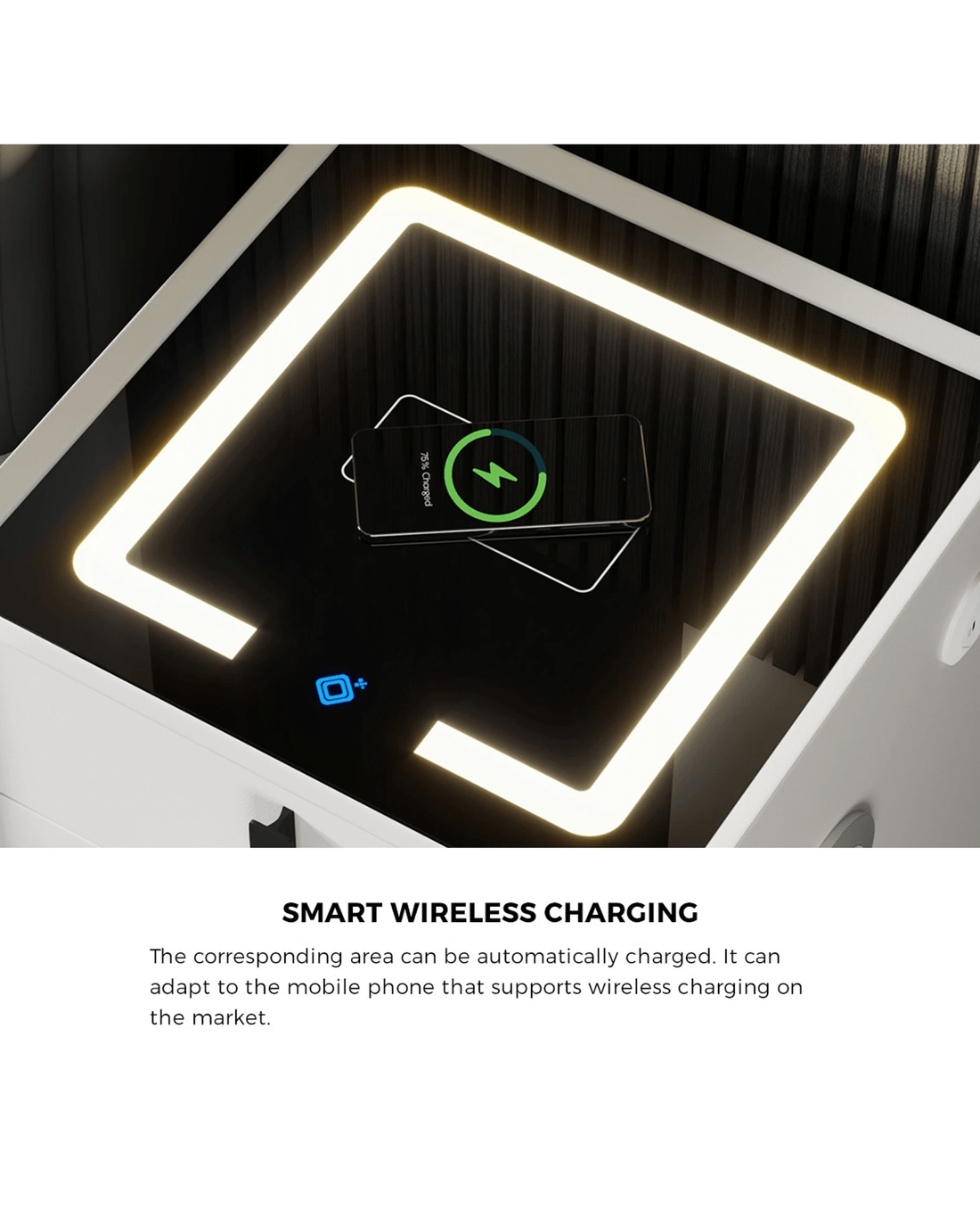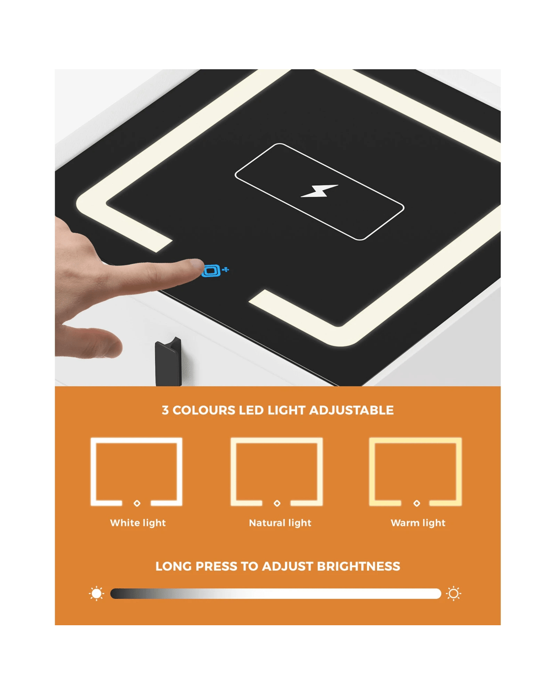 But what's really astounding about this bedside table is the adjustable 3-colour LED light strip that can easily create an ambient lighting for perfect rest and relaxation. And turning on the lighting is just a touch away. No physical switches needed to switch on or off.