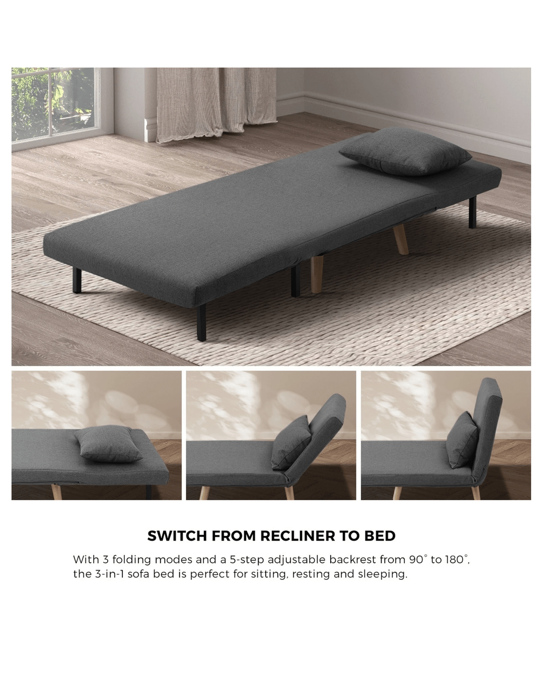 Equipped with five adjustable positions for the backrest, you can turn your lounge sofa bed into the best seat in the house for watching TV, reading, or keeping up with your social media, or nestle it down for relaxation, napping or sleeping. Likewise, when guests and relatives do drop by for an overnight visit, the lounge sofa bed is ready to accommodate them comfortably with a folding mechanism that works ever so effortlessly to transform from lounge sofa to bed in no time at all. Better still, the lounge sofa bed can be easily folded away for convenient storage. Very useful indeed when space is premium real estate in your home.