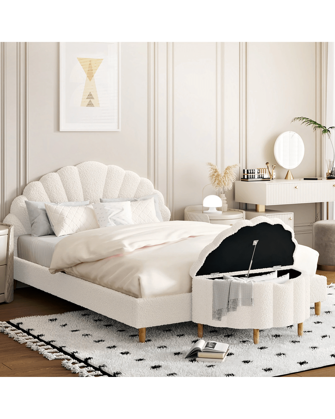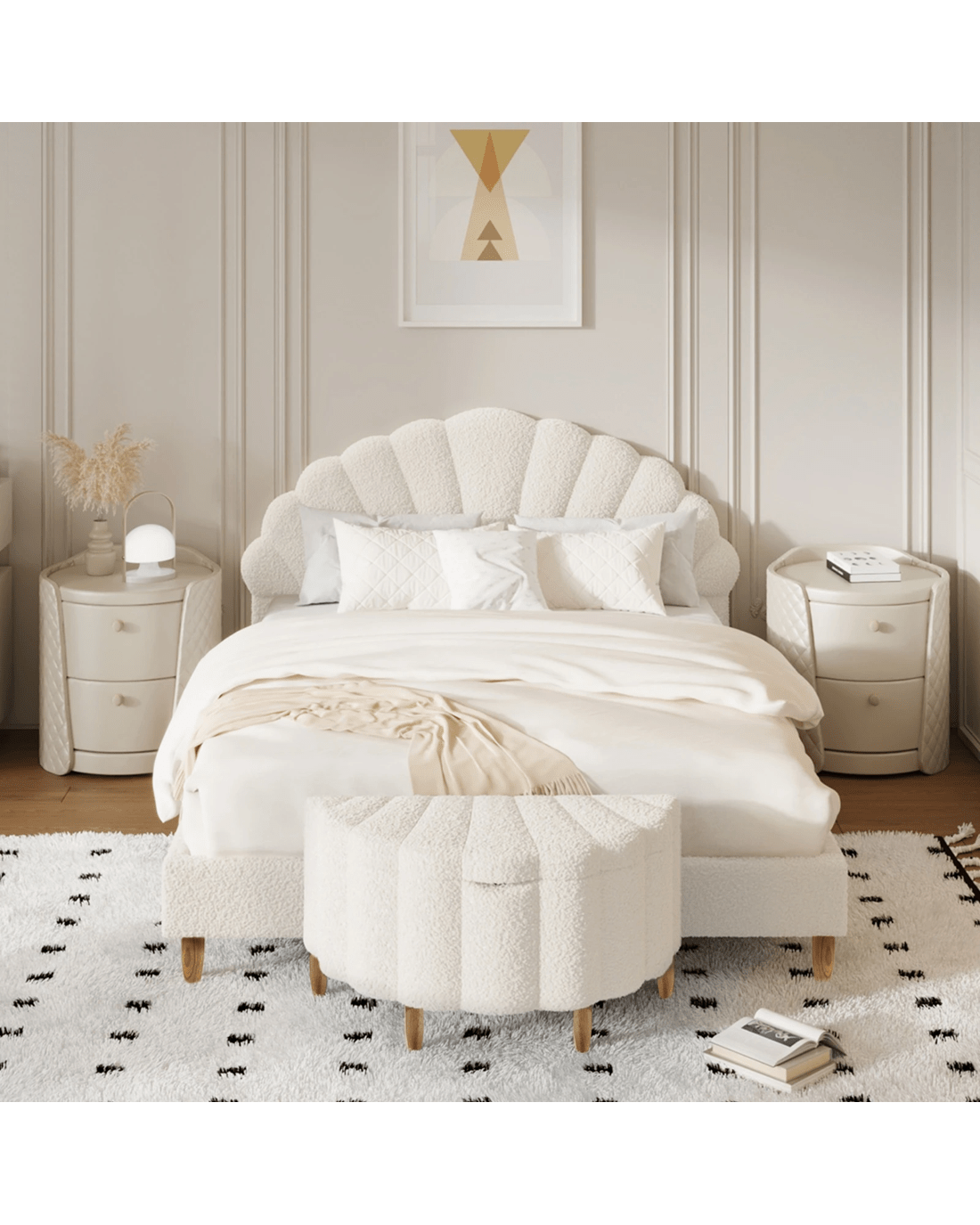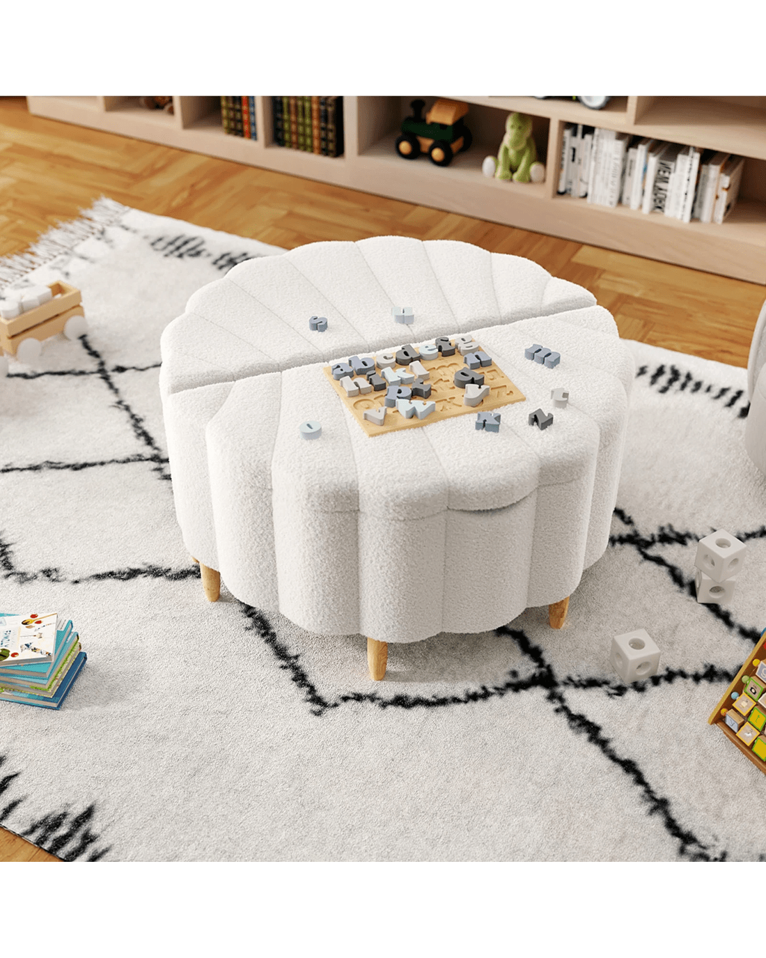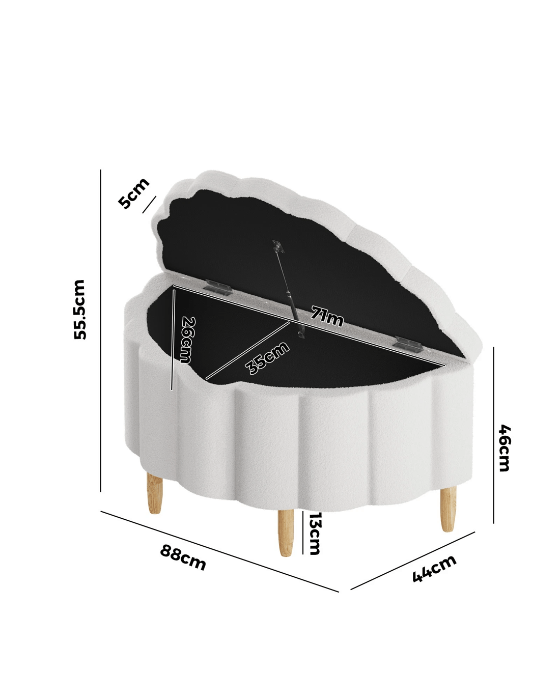 Oikiture Storage Ottoman Scallop Boucle Blanket Box Fleece Foot Stool Seat Chest - White