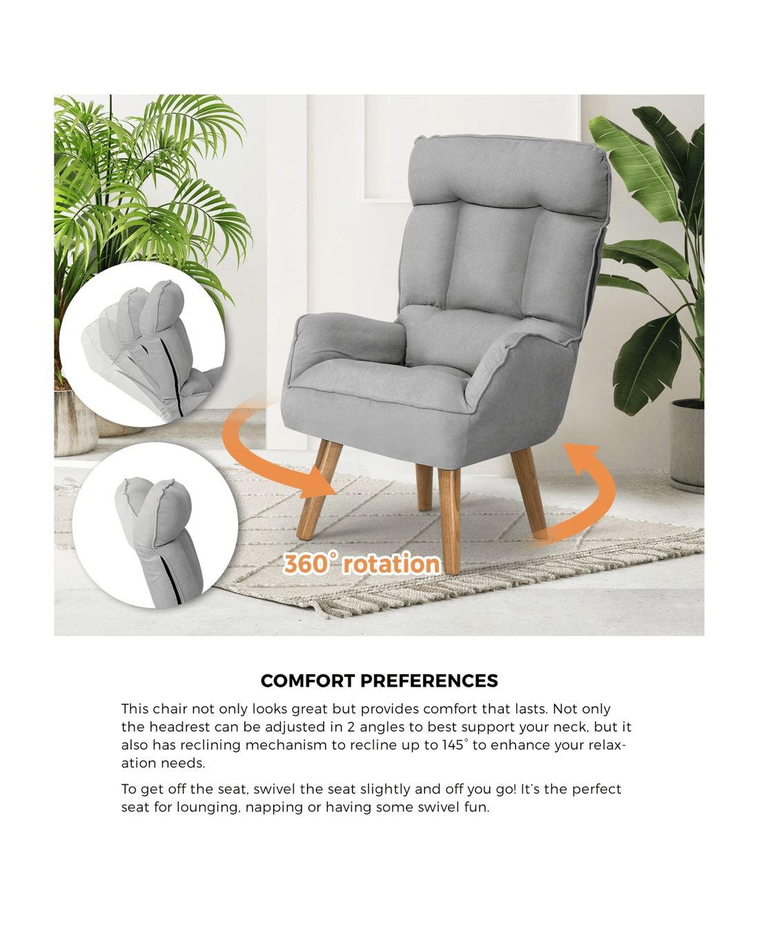 Featuring high back rest, manual reclining adjustment and adjustable headrest, you simply lean back and with simple adjustment, you're now in a perfect spot for relaxing or watching a movie. Picture-perfect for your living room or home office, simply add on a throw or cushion to make it stand out.
