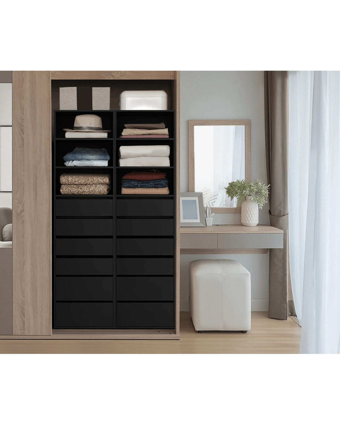 Designed to maximise space and functionality, this unit is perfect for those who need a modern storage solution that integrates with their home decor. With its built-in design, this unit is great to fit your unique storage requirement and space limitations. With its ample storage of drawers and adjustable shelves, it's perfect for storing a variety of items, from clothing to accessories and linens.