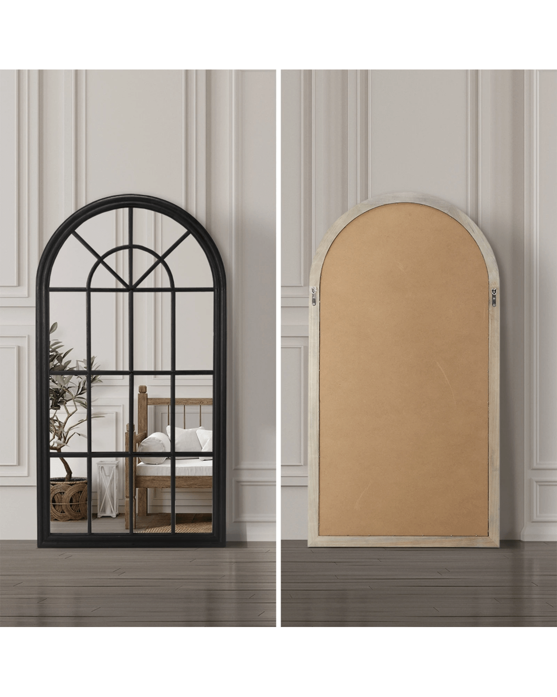 Designed to resemble a window, our window mirror frame is meticulously crafted in Paulownia wood with shatterproof glass to add a touch of elegance and sophistication to a room. The arch-shaped design and sectional panes also render a classic look to highlight its vintage charm and character and inspire thematic decor.