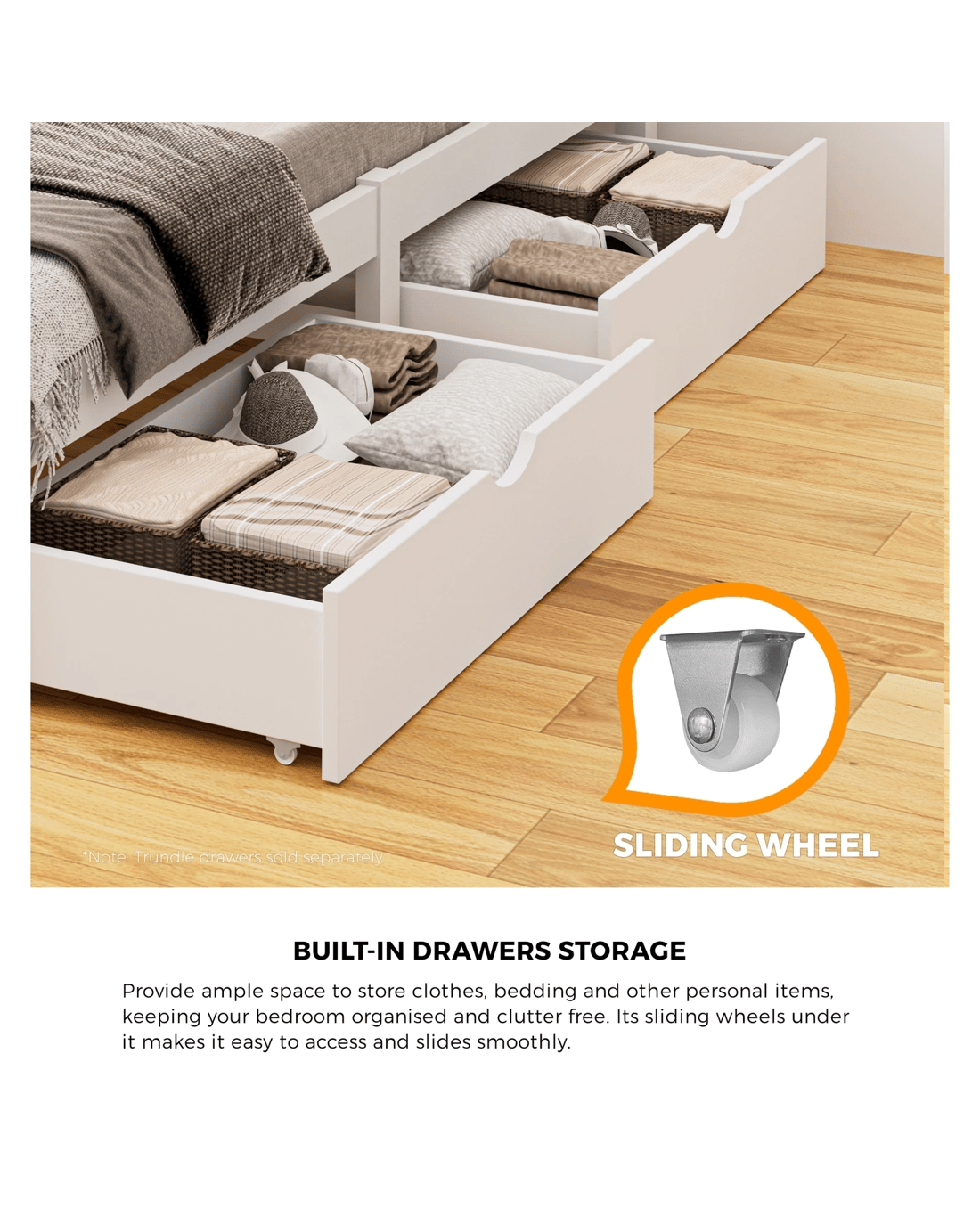 Trundle drawers with castor wheels