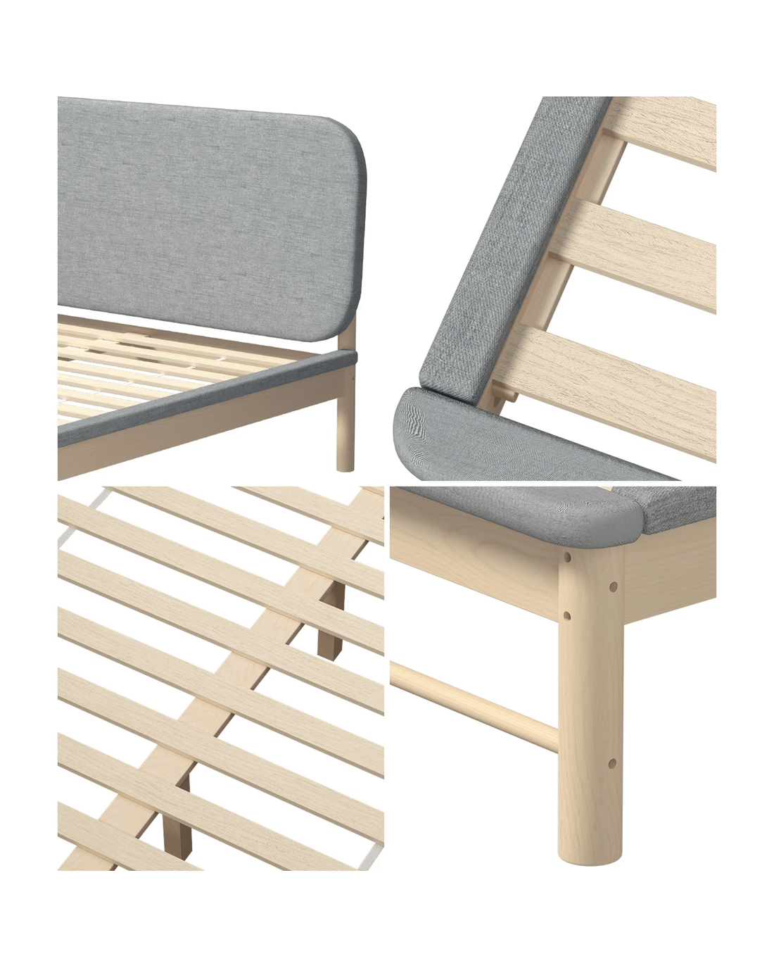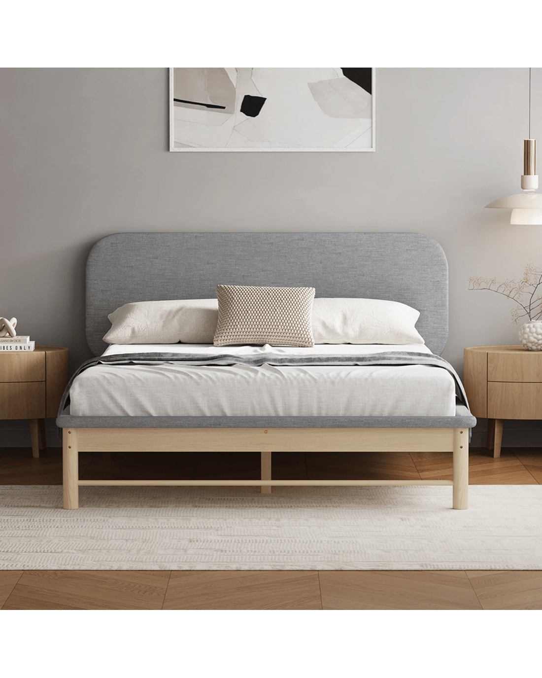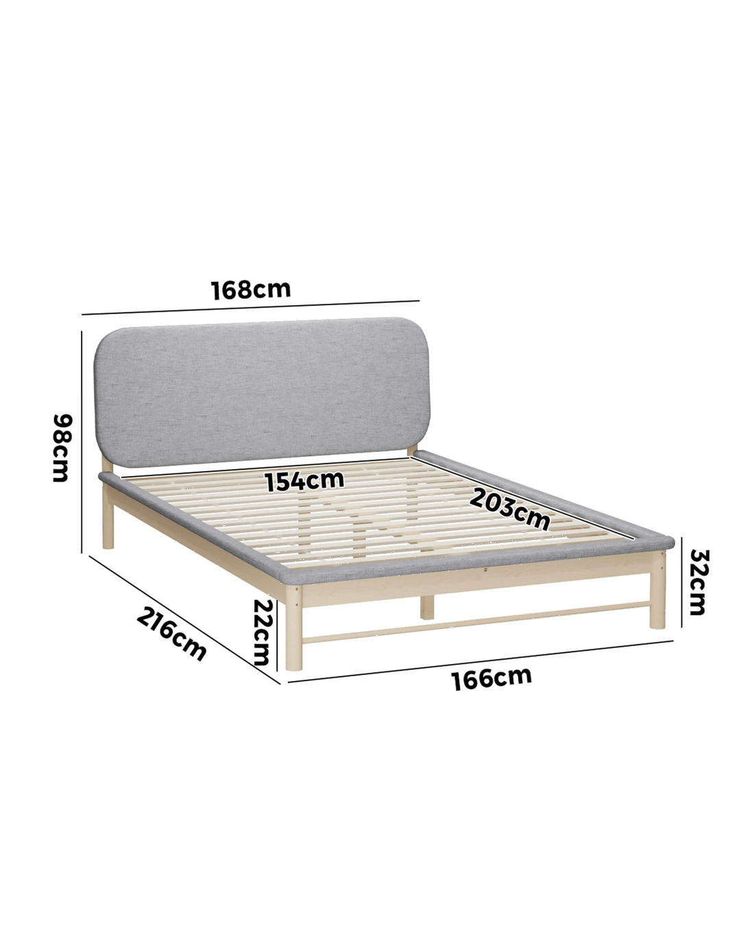 Sold by Kamprad's Oikos 1943Oikiture Wooden Bed Frame With Padded Fabric Edges Pine Headboard Base Queen - Grey