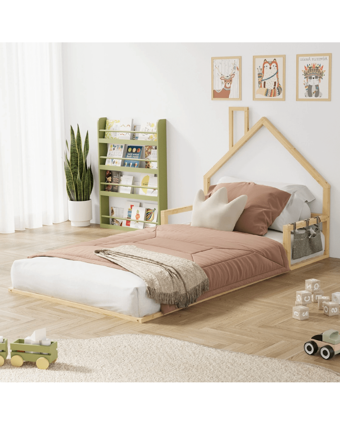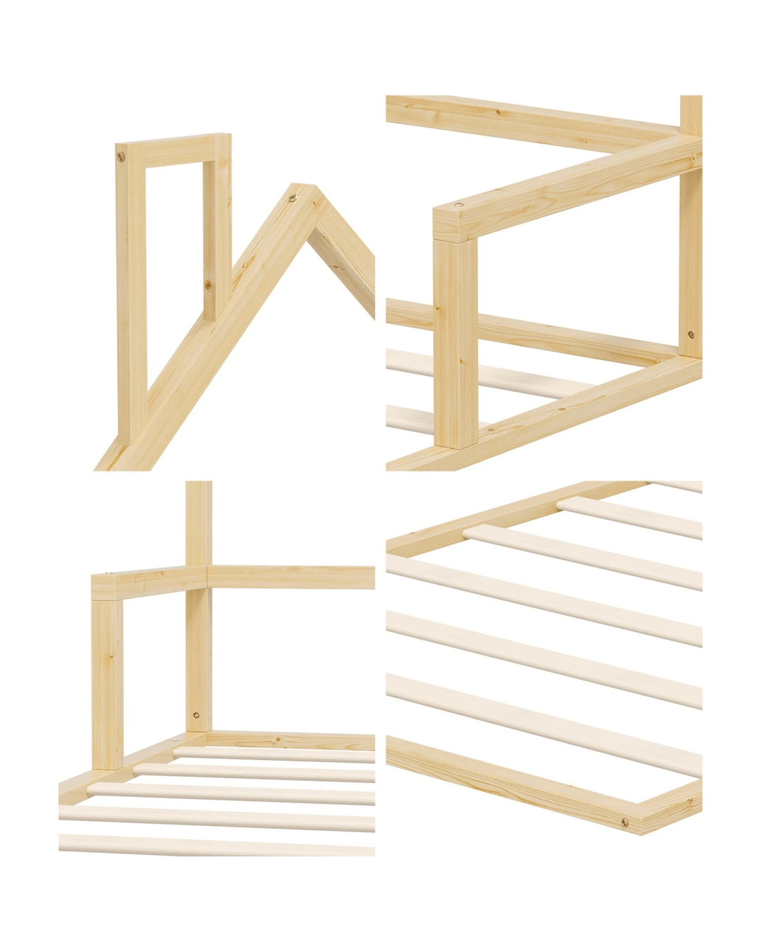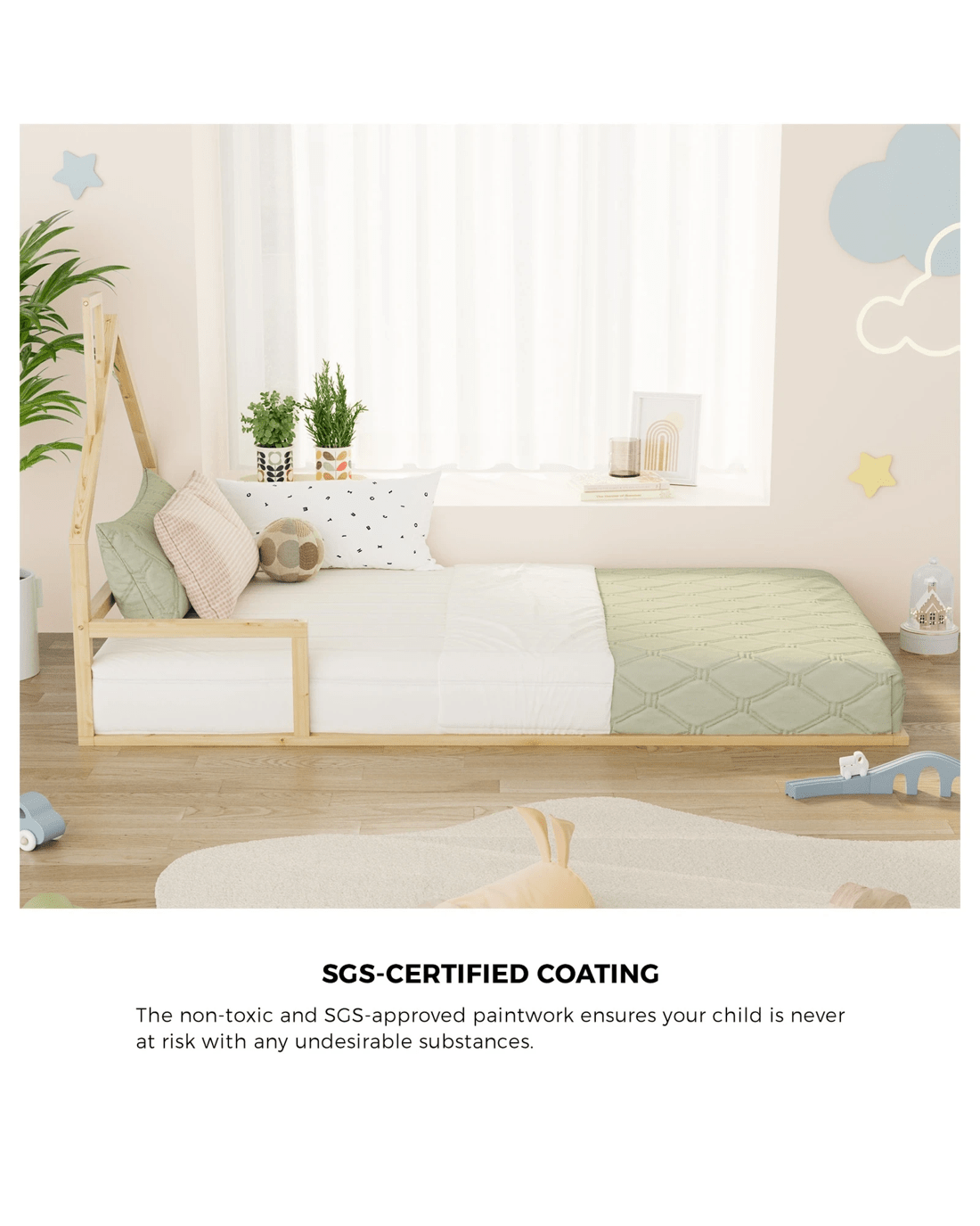 Constructed of solid pine wood and MDF, the sturdy frame is strong and durable with smooth edges for safe use. The finishing is meticulous as well as non-toxic and SGS-approved paintwork to ensure your child is never at risk with any undesirable substances. Plus, being made close to the ground, the bed base allows for hassle-free egress and exit and prevents any unfortunate incidents.