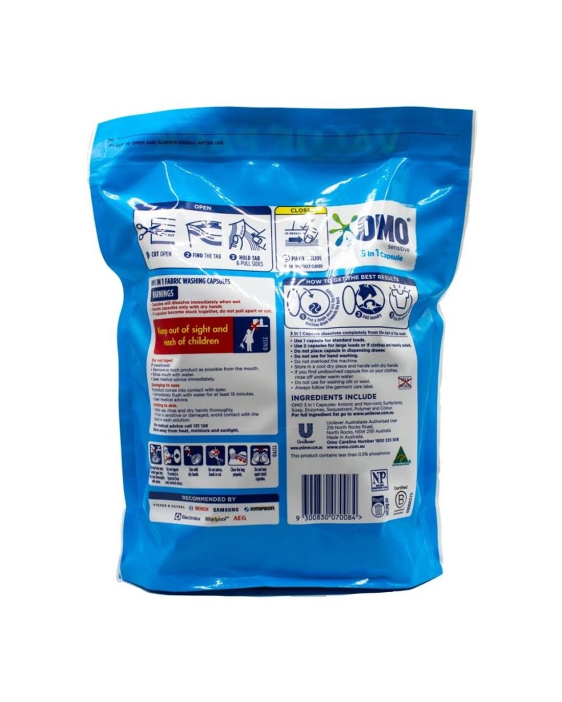 The OMO Sensitive Laundry Capsule Pods are designed for gentle yet effective cleaning, making laundry simpler and more suitable for sensitive skin. These dermatologically tested capsules are ideal for allergy-prone users, babies, and anyone seeking a fragrance-free and dye-free laundry solution.Each capsule combines detergent, stain remover, and fabric care in one convenient, mess-free package. They are compatible with both cold and hot washes, ensuring versatile cleaning performance while saving energy. The biodegradable film ensures an eco-friendly approach to laundry care.Key Features:Gentle Yet Effective Cleaning Delivers a powerful clean while being safe for sensitive skin, including allergy-prone users and babies.All-in-One Laundry Solution Combines detergent, stain remover, and fabric care in a single capsule for easy, efficient washing.Fragrance & Dye Free Free from perfumes and colourants, making it suitable for sensitive skin, allergies, and young children.Effective at All Temperatures Works well in both cold and hot water, saving energy and maintaining cleaning power.Mess-Free & Convenient Pre-measured capsules eliminate spills and the need for measuring, simplifying laundry routines.Specifications:Brand: OMOPack Type: PKProduct Type: Laundry CapsulesFeatures: 3-in-1 formula, fragrance free, dye free, dermatologically tested, compatible with cold and hot washes, mess-freeQuantity: 60 capsules