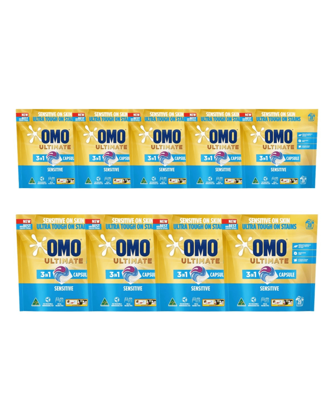 9 x 28pk Omo Ultimate 3 in 1 Sensitive Laundry Detergent Capsules (252 Capsules)
