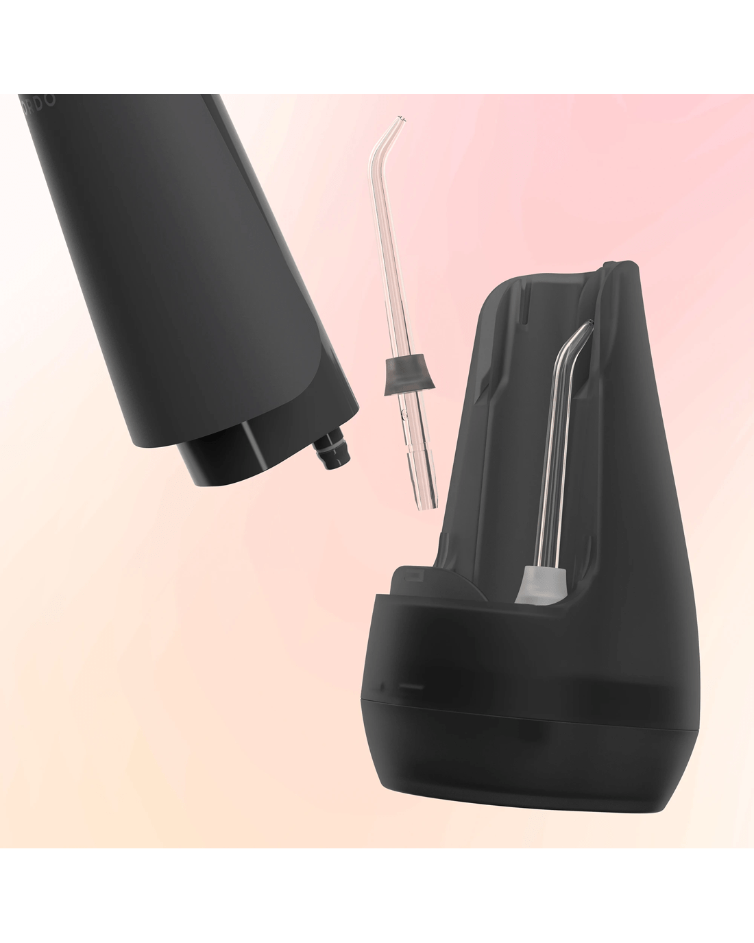 Product Details- Includes Ordo Hydro Sonic Water Flosser and 4 x Ordo hydro Sonic Floss Tips (2 x floss tips with a light collar and 2 x floss tips with a dark collar)