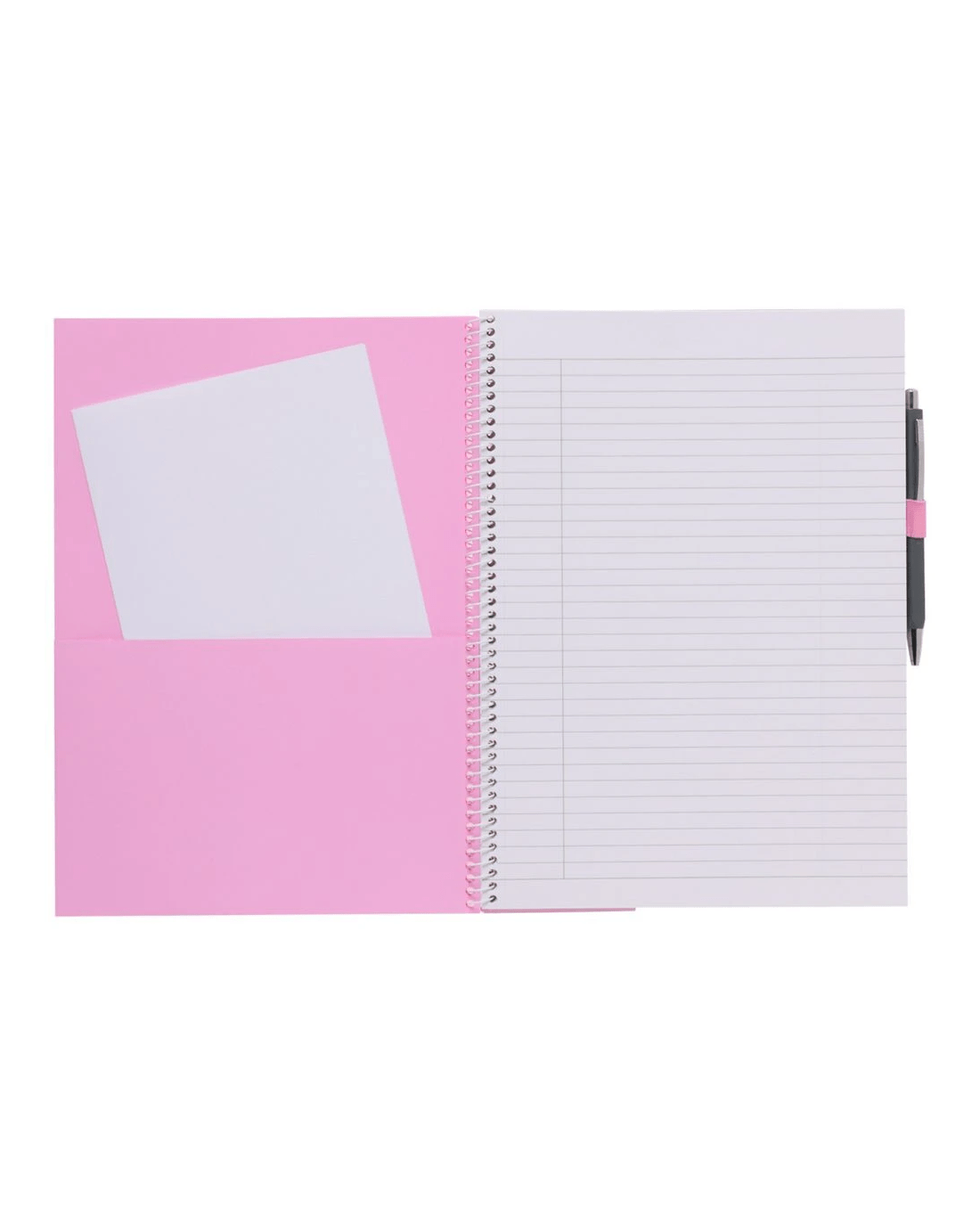- Paper for pages, pocket & back cover made from 100% post-consumer recycled content like old notebooks. Plastic for front cover made from 100% post-consumer recycled materials. Claim excludes wire spiral and elastic / rubber band made from virgin materials.