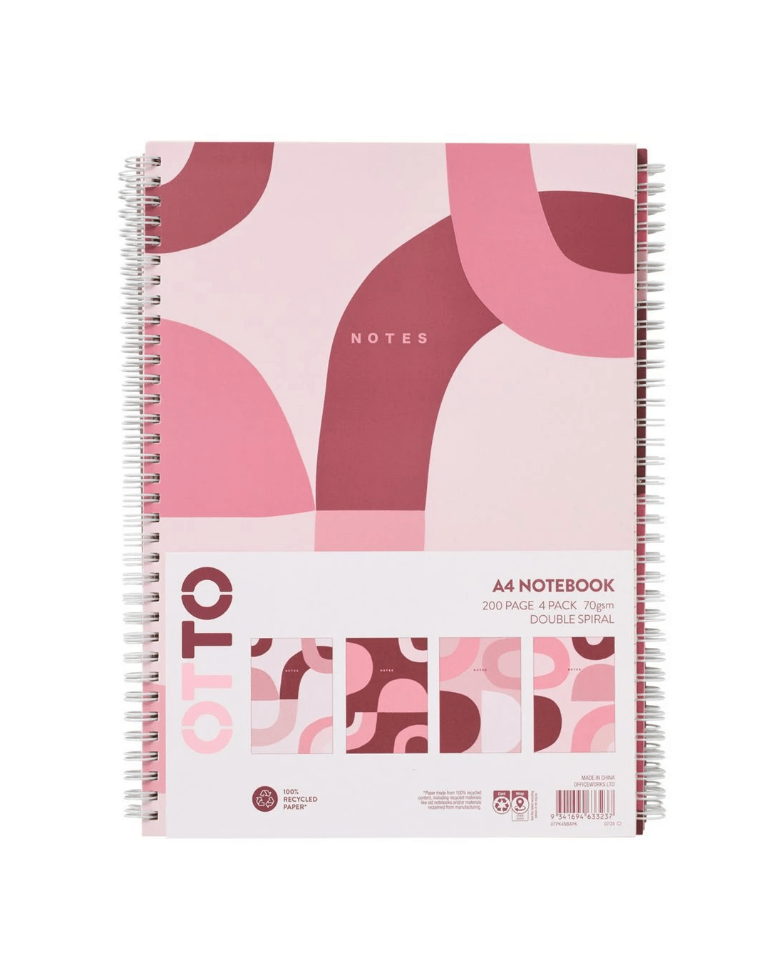 Sold by OfficeworksOtto A4 Spiral Notebook 200 Page Abstract Pink 4 Pack