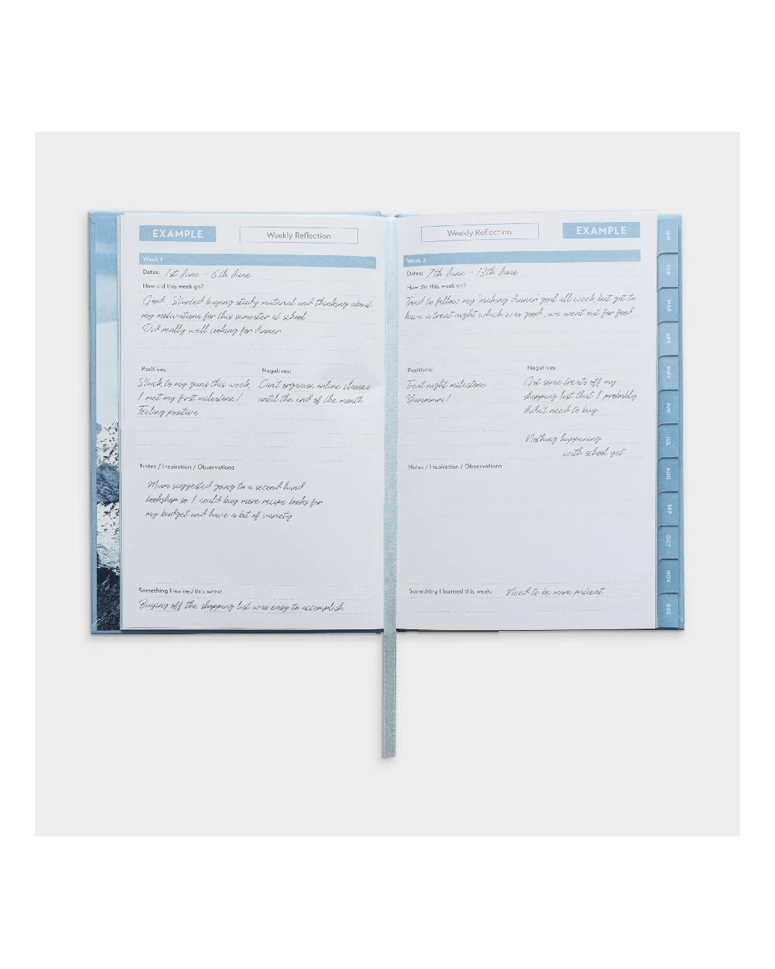- Inside, there are sections for self-reflection, weekly and monthly reflection, a monthly goals focus and plan, and a yearly review.