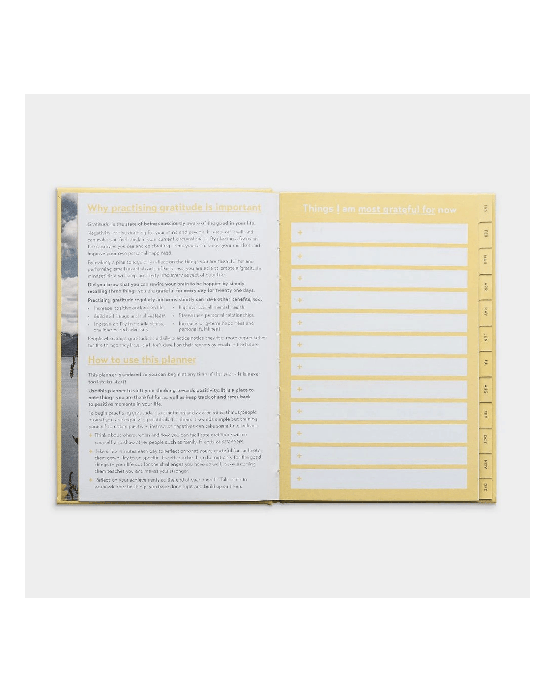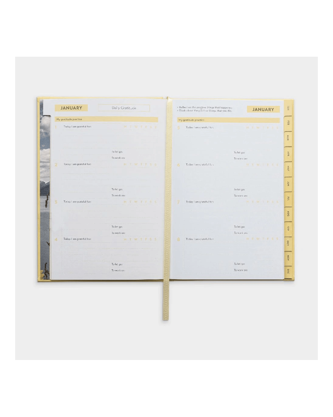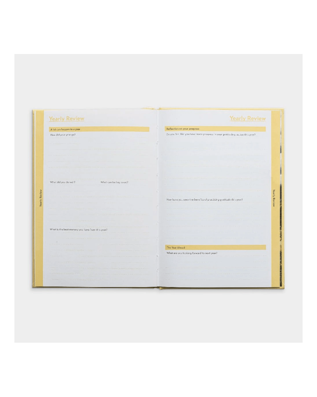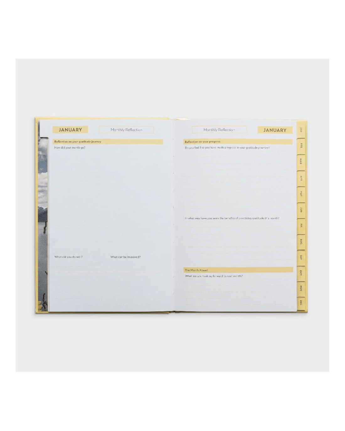 - Inside, there are sections for monthly reflection, daily gratitude, and a yearly review.
