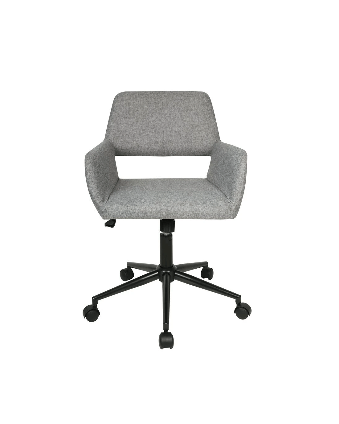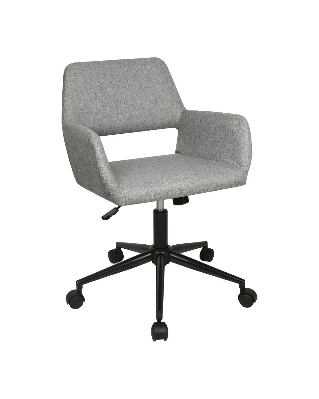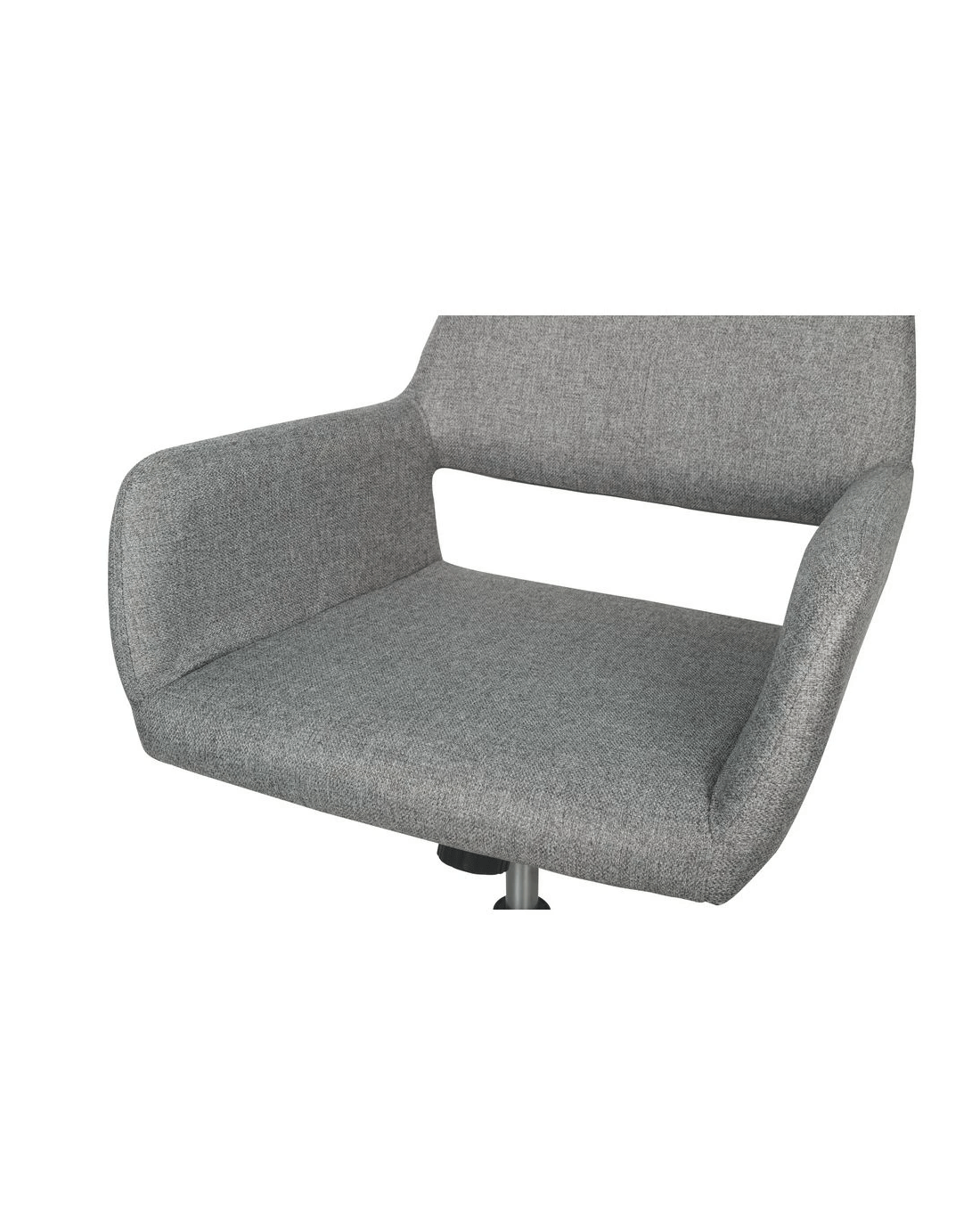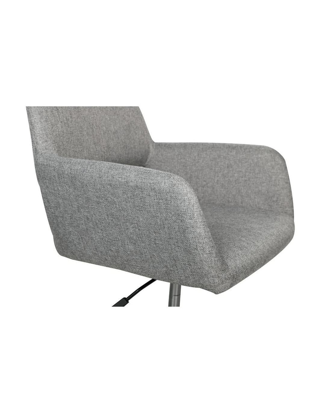 - The backrest and seat are covered in a grey fabric while the frame and metal base is black.