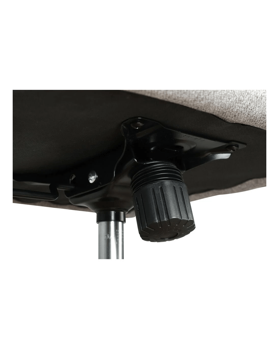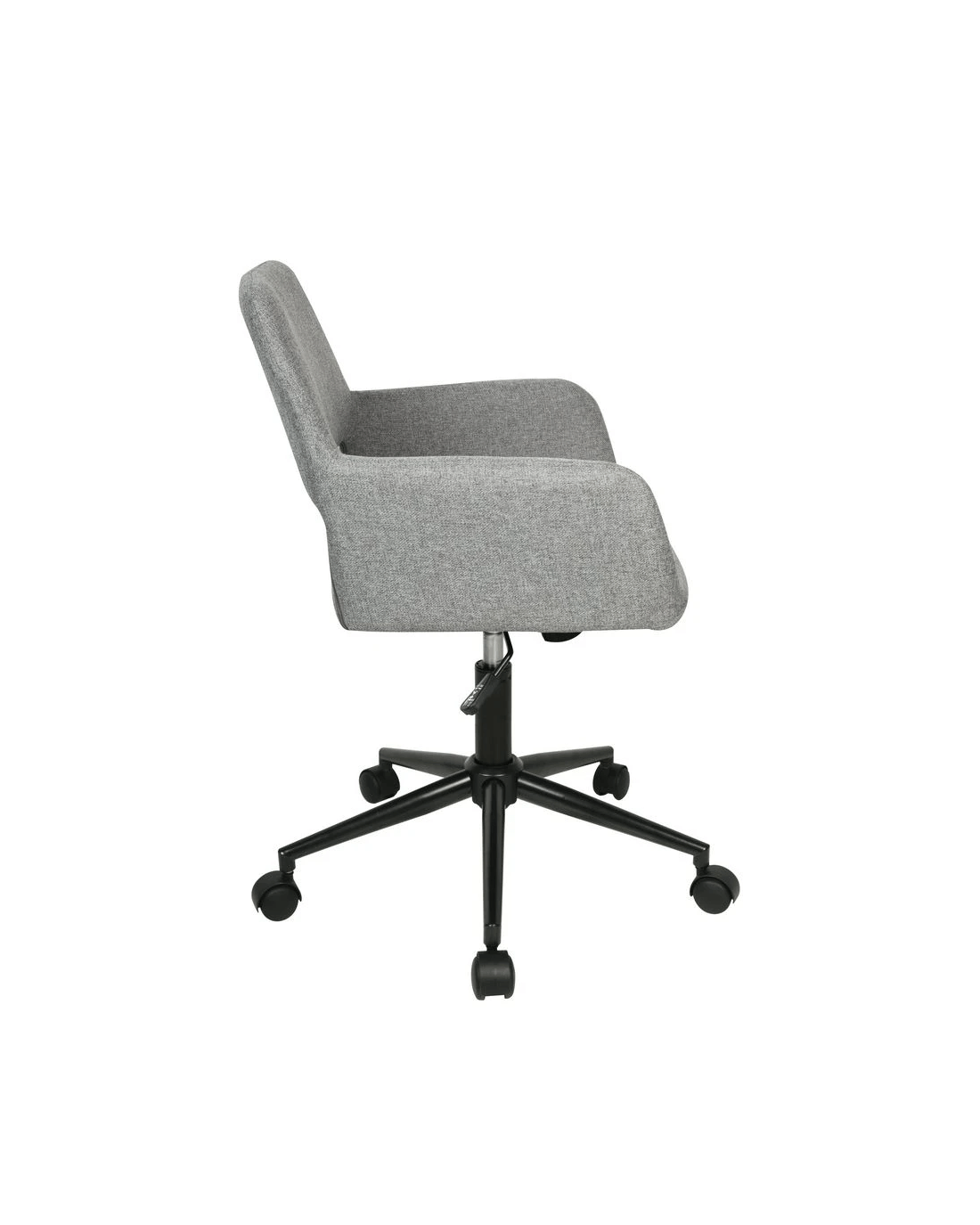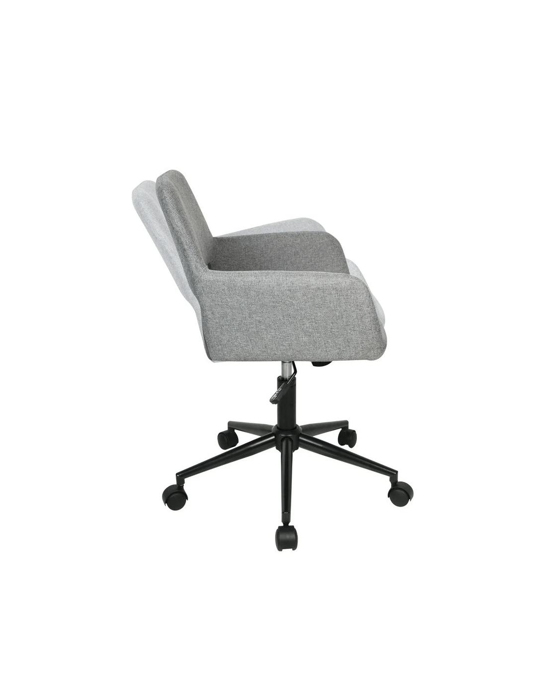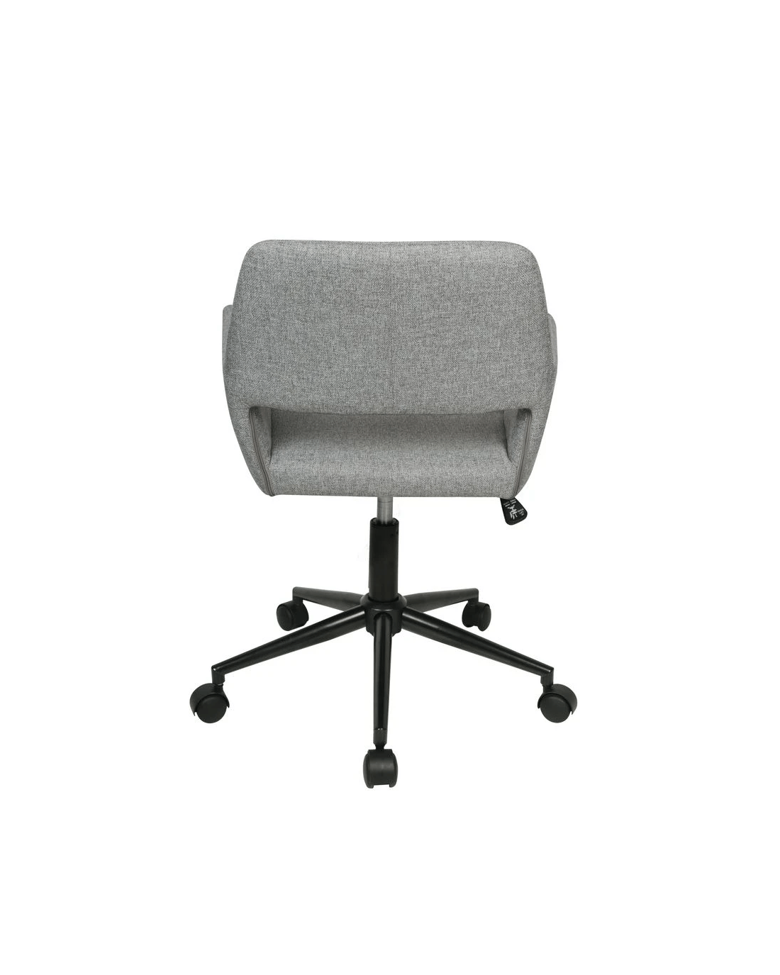 - The backrest and seat are covered in a grey fabric while the frame and metal base is black.