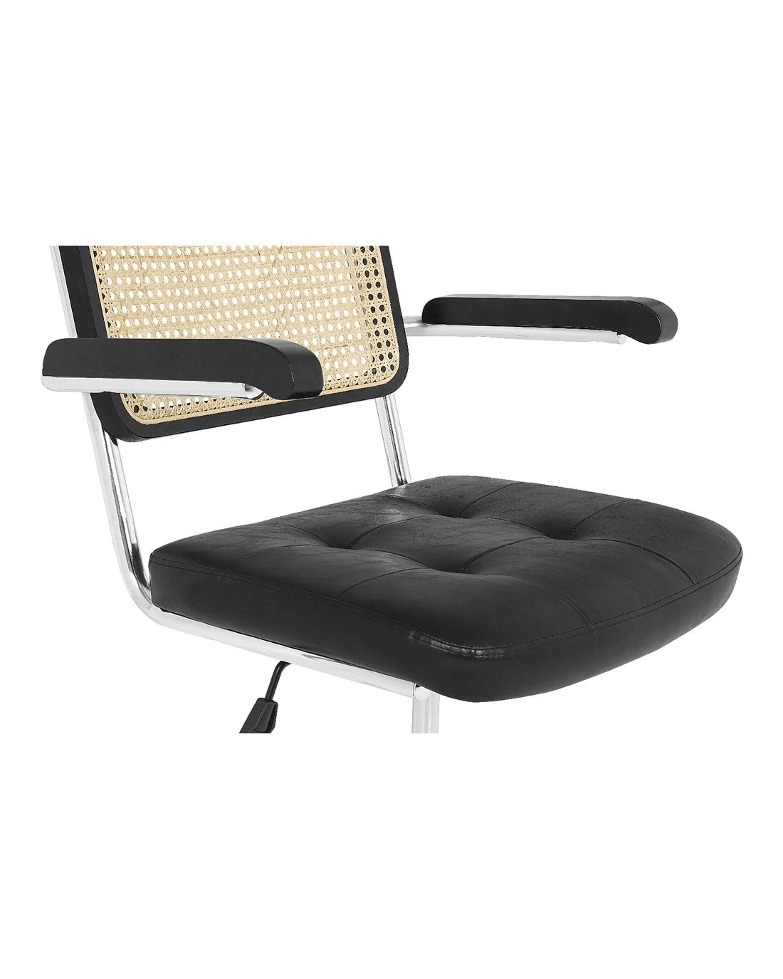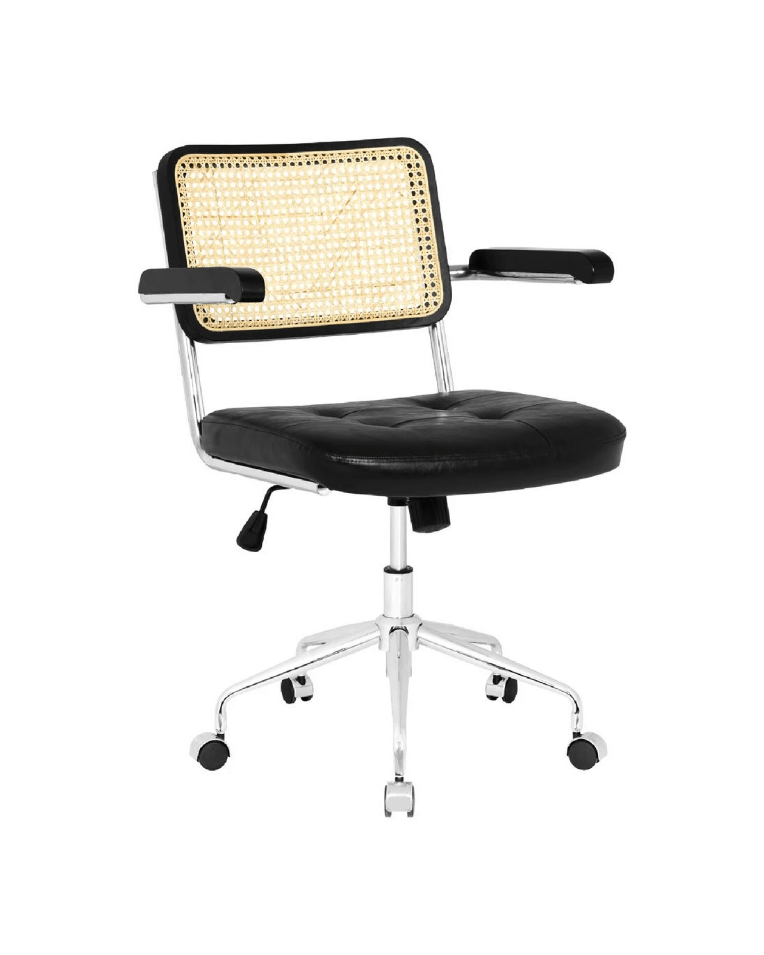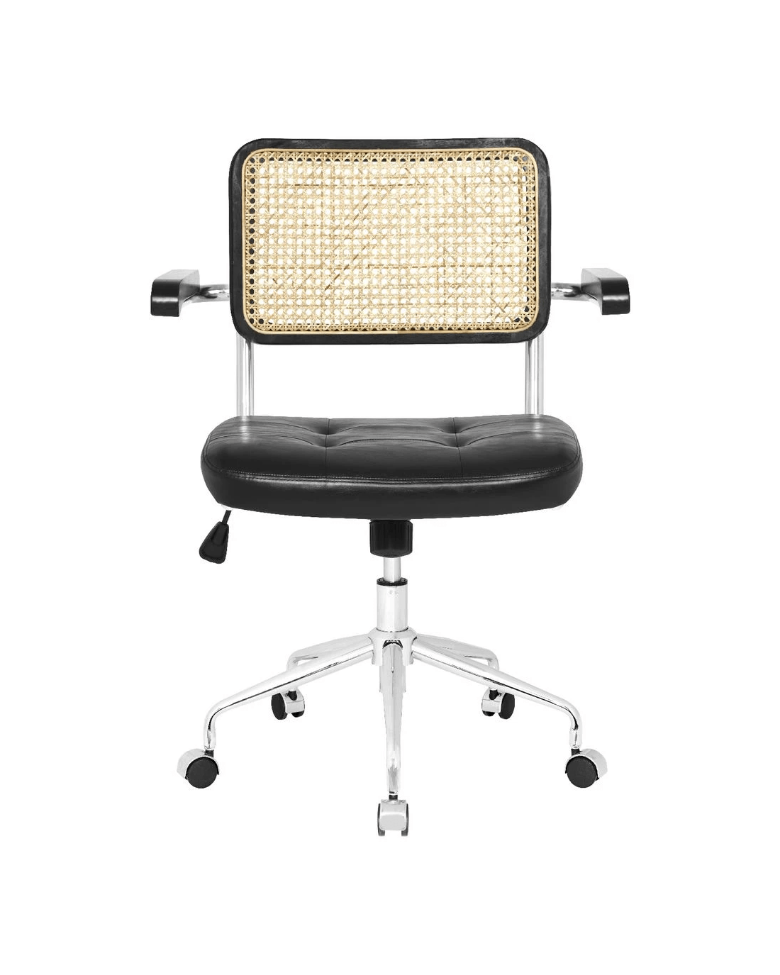 The Otto Nusa Rattan Chair brings a relaxed, bohemian style to any home office. A rattan backrest and PU padded seat provide comfort while the chrome base offers 360 degree swivel andfixed armrests give additional support when working. The black colourway will make a great addition to your workspace décor.
