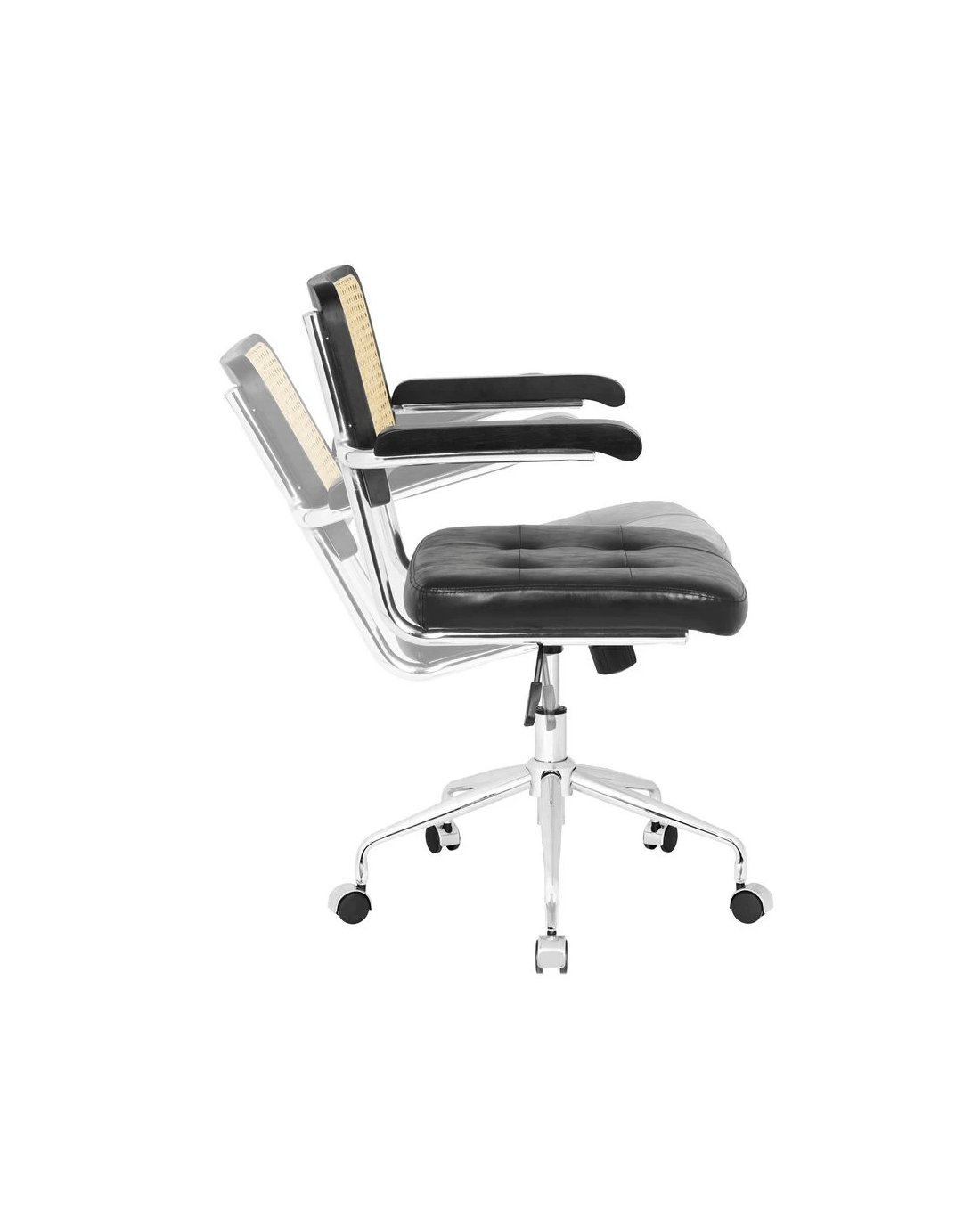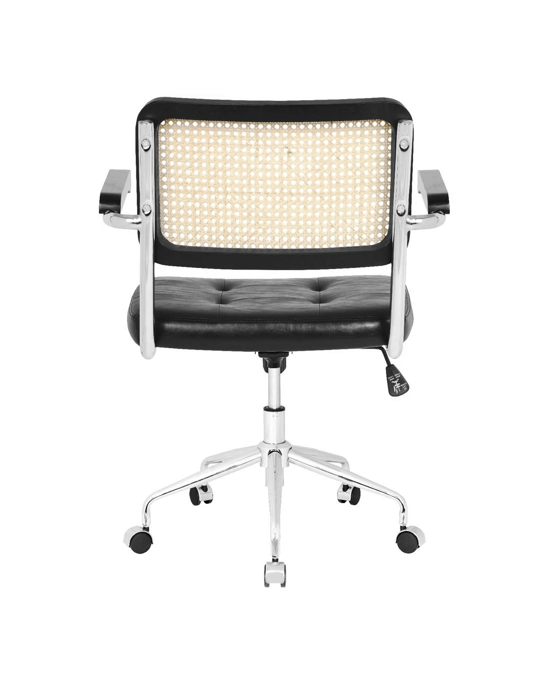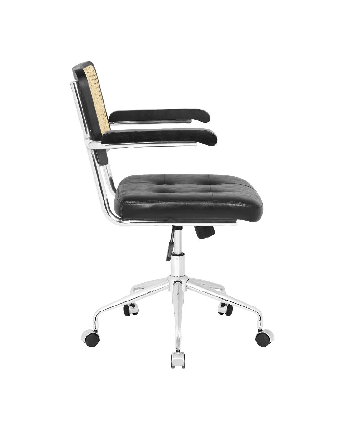 The Otto Nusa Rattan Chair brings a relaxed, bohemian style to any home office. A rattan backrest and PU padded seat provide comfort while the chrome base offers 360 degree swivel andfixed armrests give additional support when working. The black colourway will make a great addition to your workspace décor.