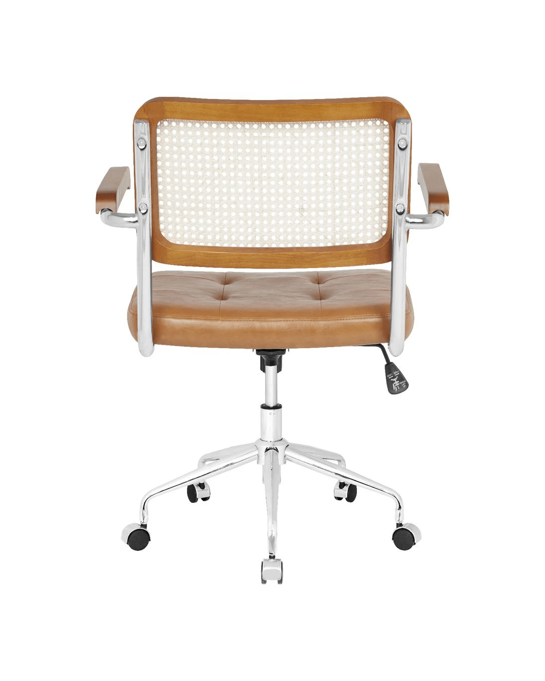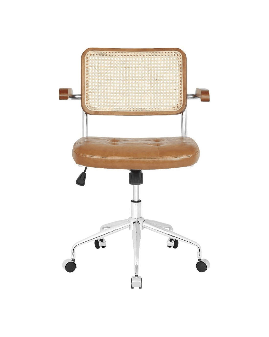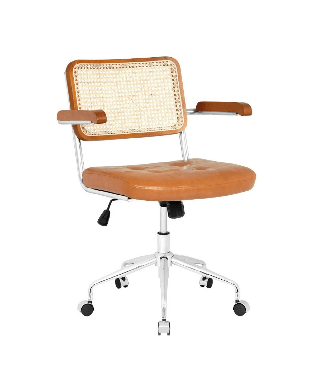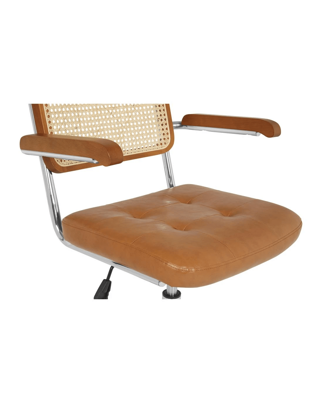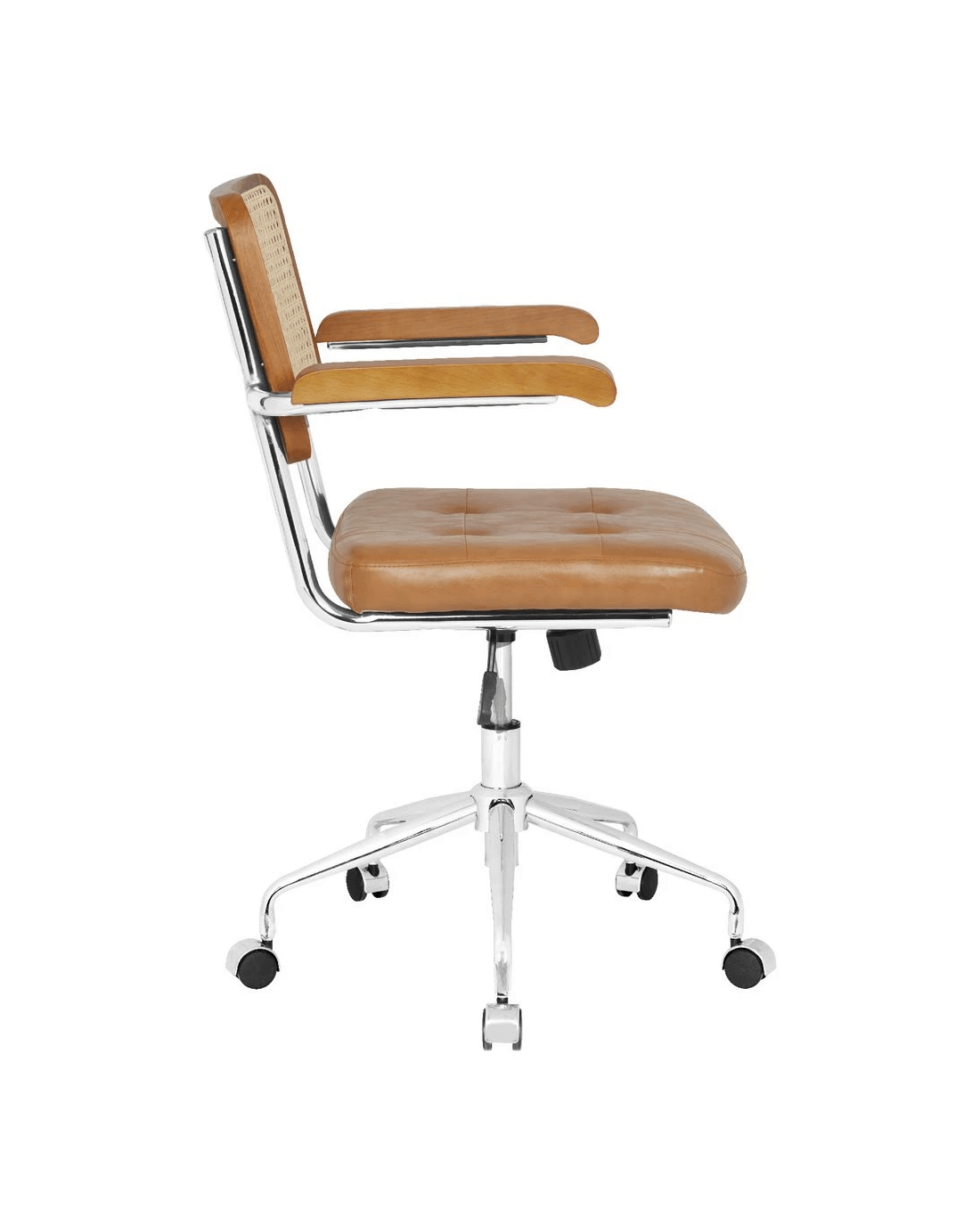 The Otto Nusa Rattan Chair brings a relaxed, bohemian style to any home office. A rattan backrest and PU padded seat provide comfort while the chrome base offers 360 degree swivel and timber-like fixed armrests let you work in your best position. The tan colourway will make a great addition to your workspace décor.