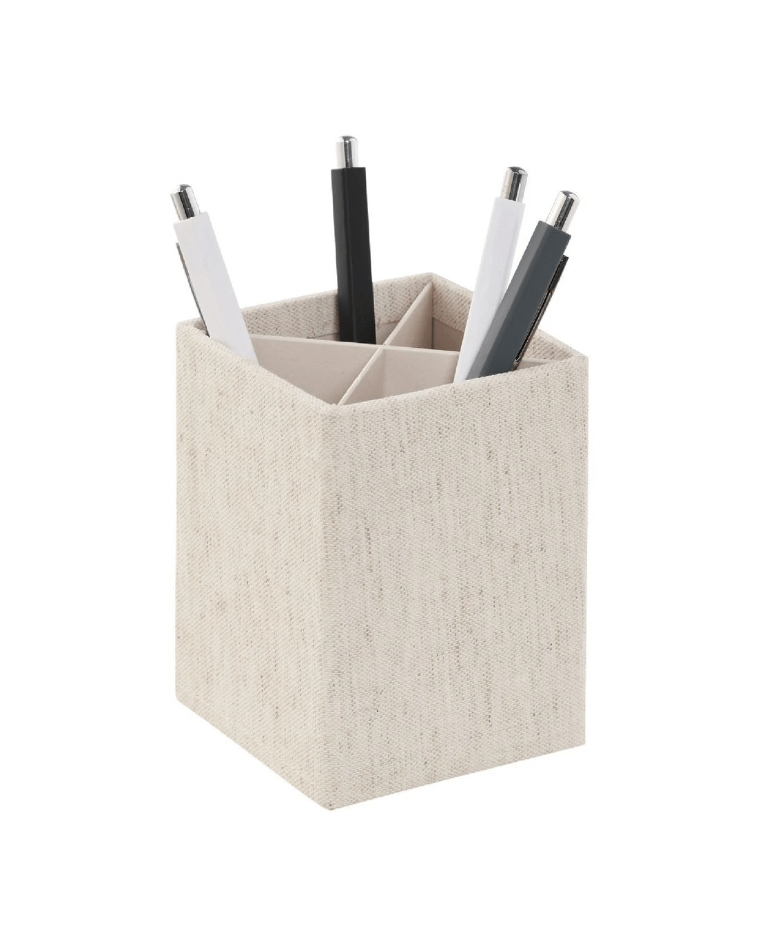 This Otto Natural Linen Look Pen Cup features 4 dividers so you can organise your pens, pencils, rulers and other stationery items. The dividers are also removable so you can use it to hold different items and the pen cup itself has a stylish design making it a fashionable addition to your workspace.