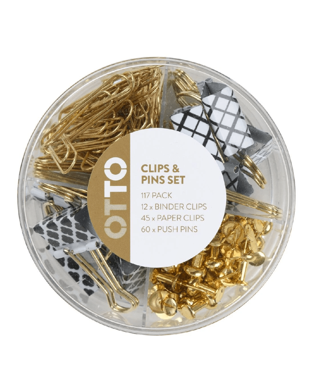 Sold by OfficeworksOtto Pin & Clip Set Black/Gold 117 Pack