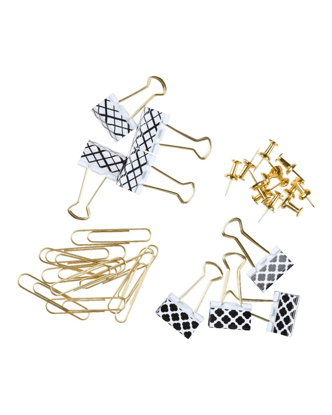 - This pack comes with 60x push pins, 6x 25mm binder clips, 45x jumbo paper clips and 6x 25mm design binder clips.