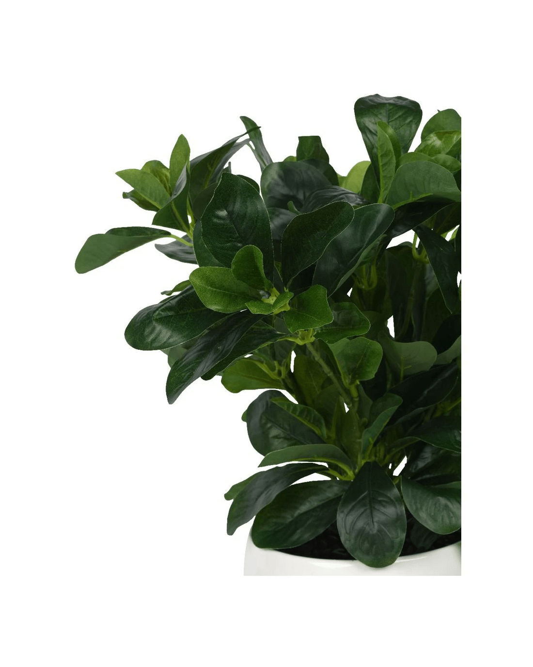 This Otto Round White Glazed Pot features a textured appearance, as well as a plastic plant for greenery. It's perfect for brightening up any space.