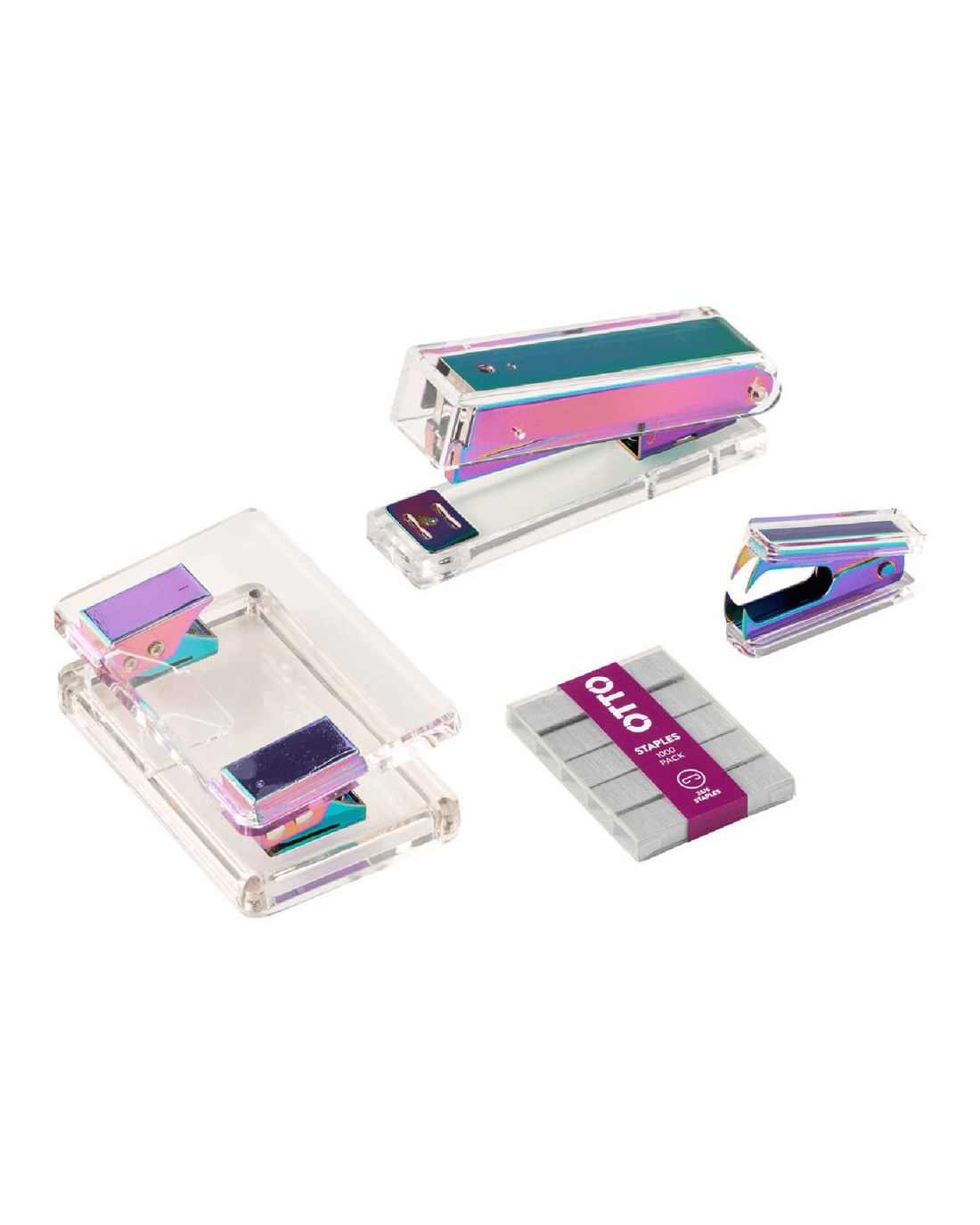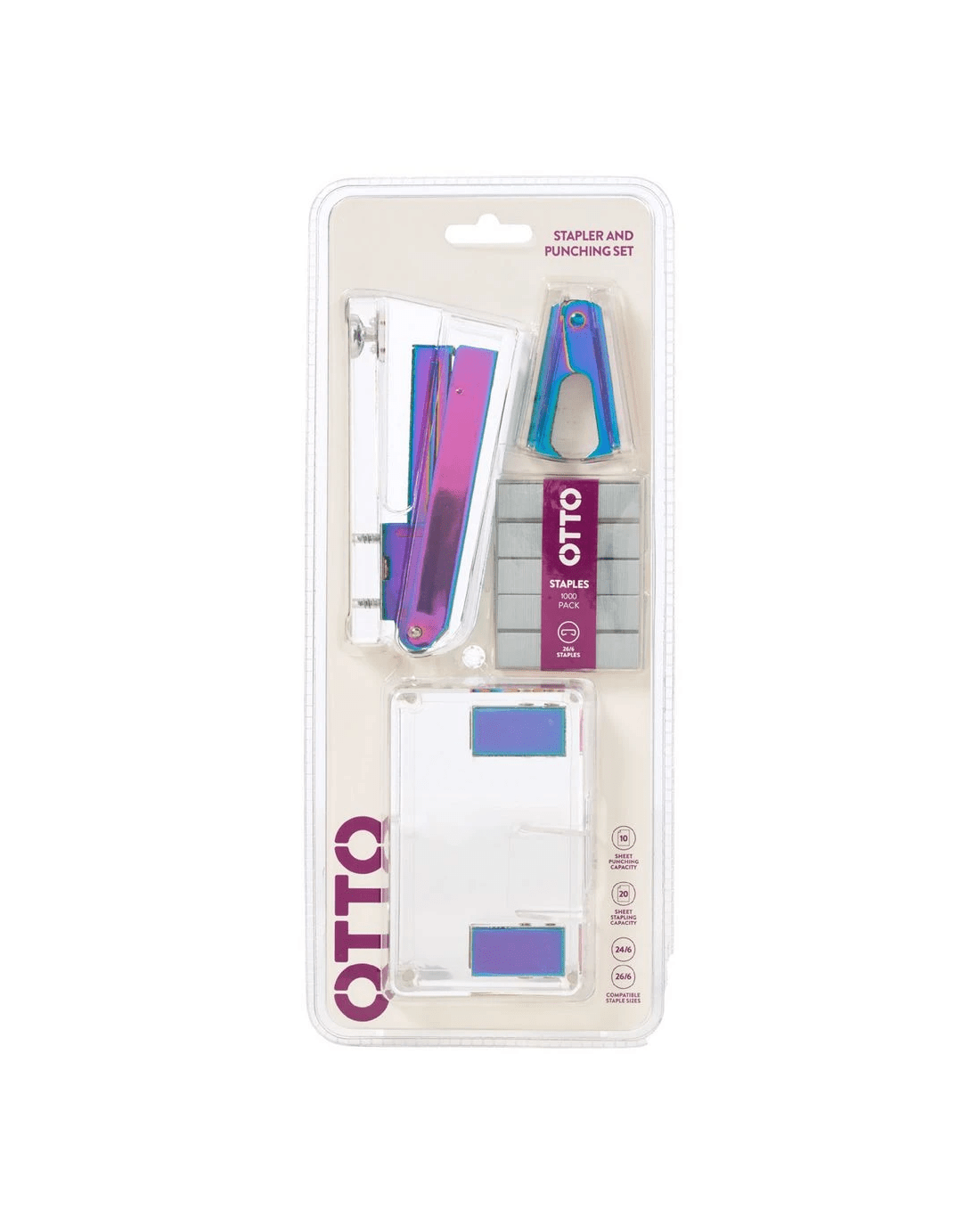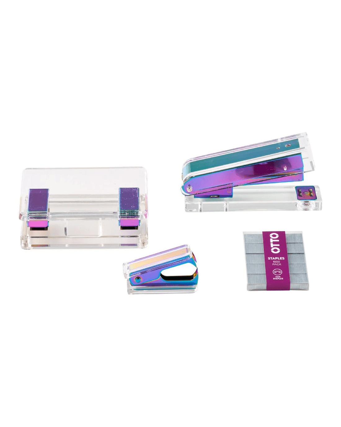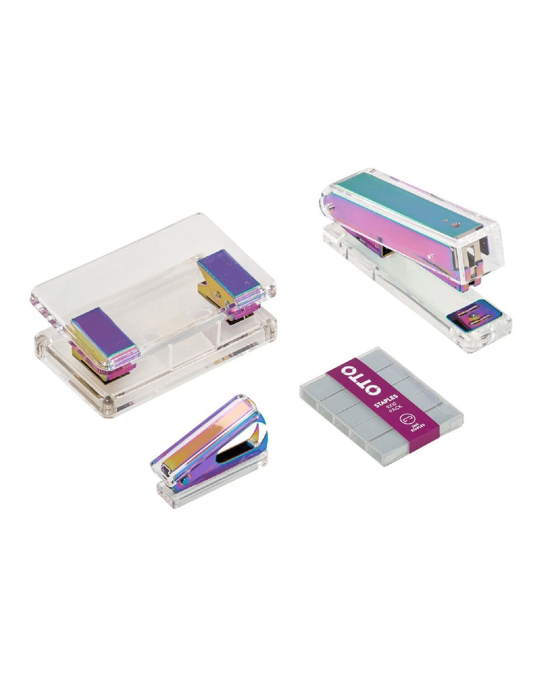 Add a touch of style to your desk with this Acrylic Stapler Set from Otto. It comes with a stapler, a 2 hole punch, and 500 staples to get you started. Plus, it's got an eye catching acrylic design to help bring life to your space.