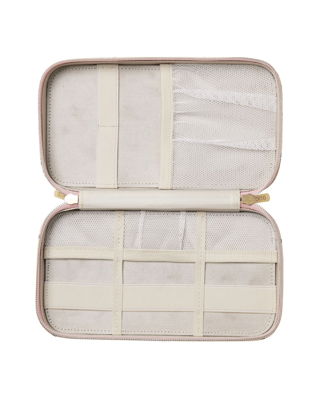 - It zips out flat and features stretch mesh pockets and elastic straps.