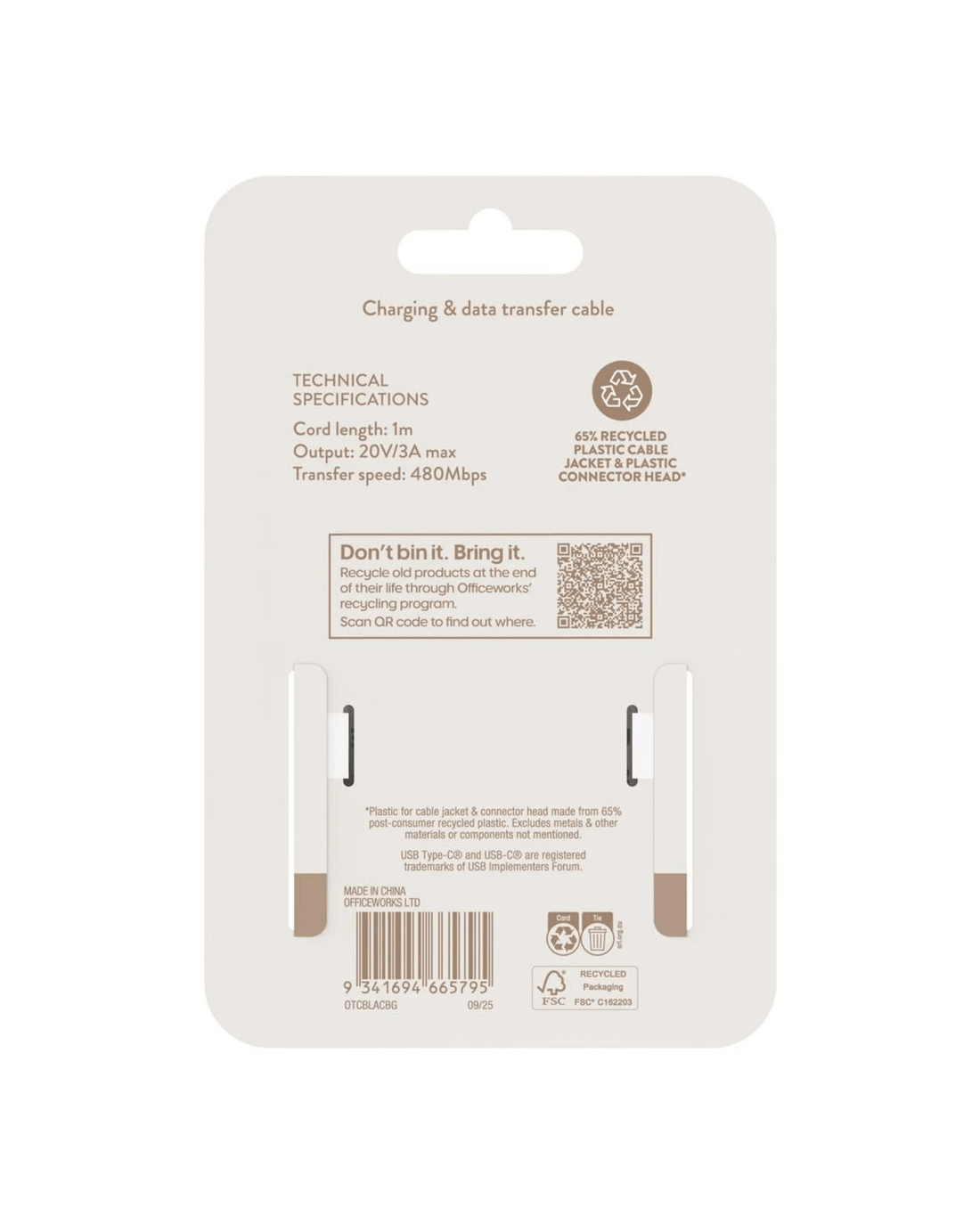 - Plastic for cable jacket & connector head made from 65% post-consumer recycled plastic. Excludes metals & other materials or components not mentioned.