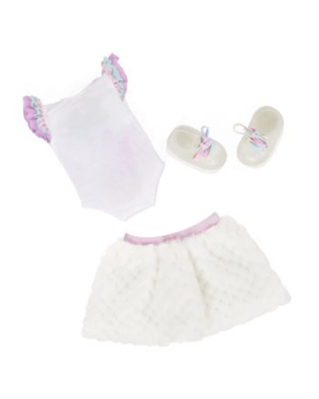- Includes: 18-inch doll, a pair of earrings, a rainbow-themed necklace with 2 matching bracelets, 3 jewelry charms, a pink jewelry box, a cute leotard, a faux-fur skirt, and shoes with rainbow laces.