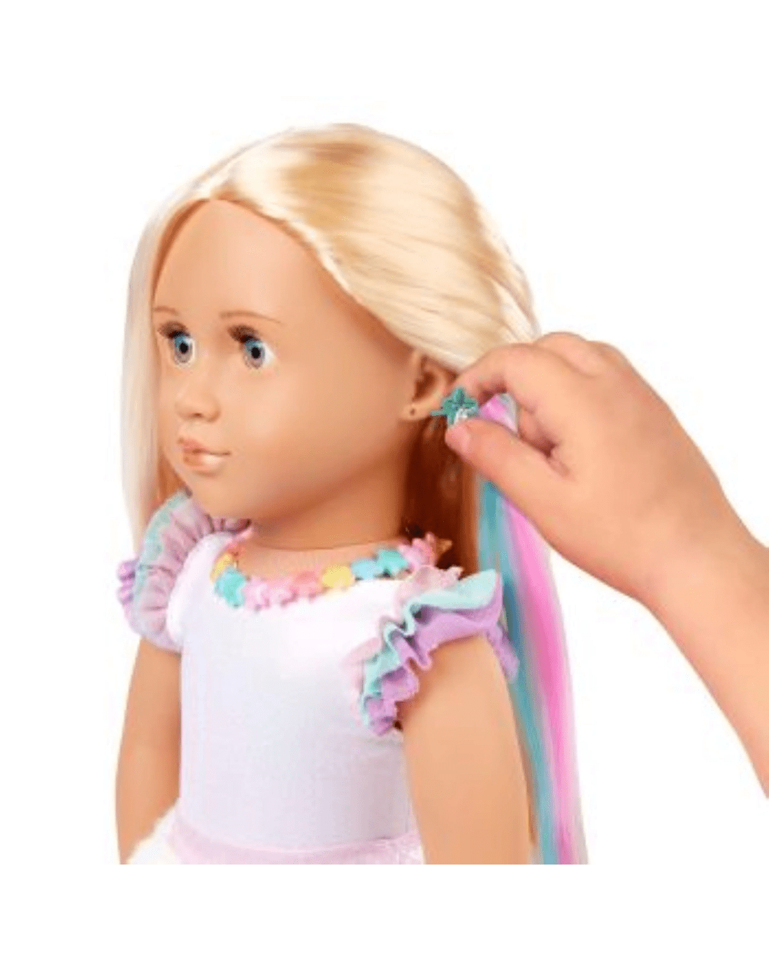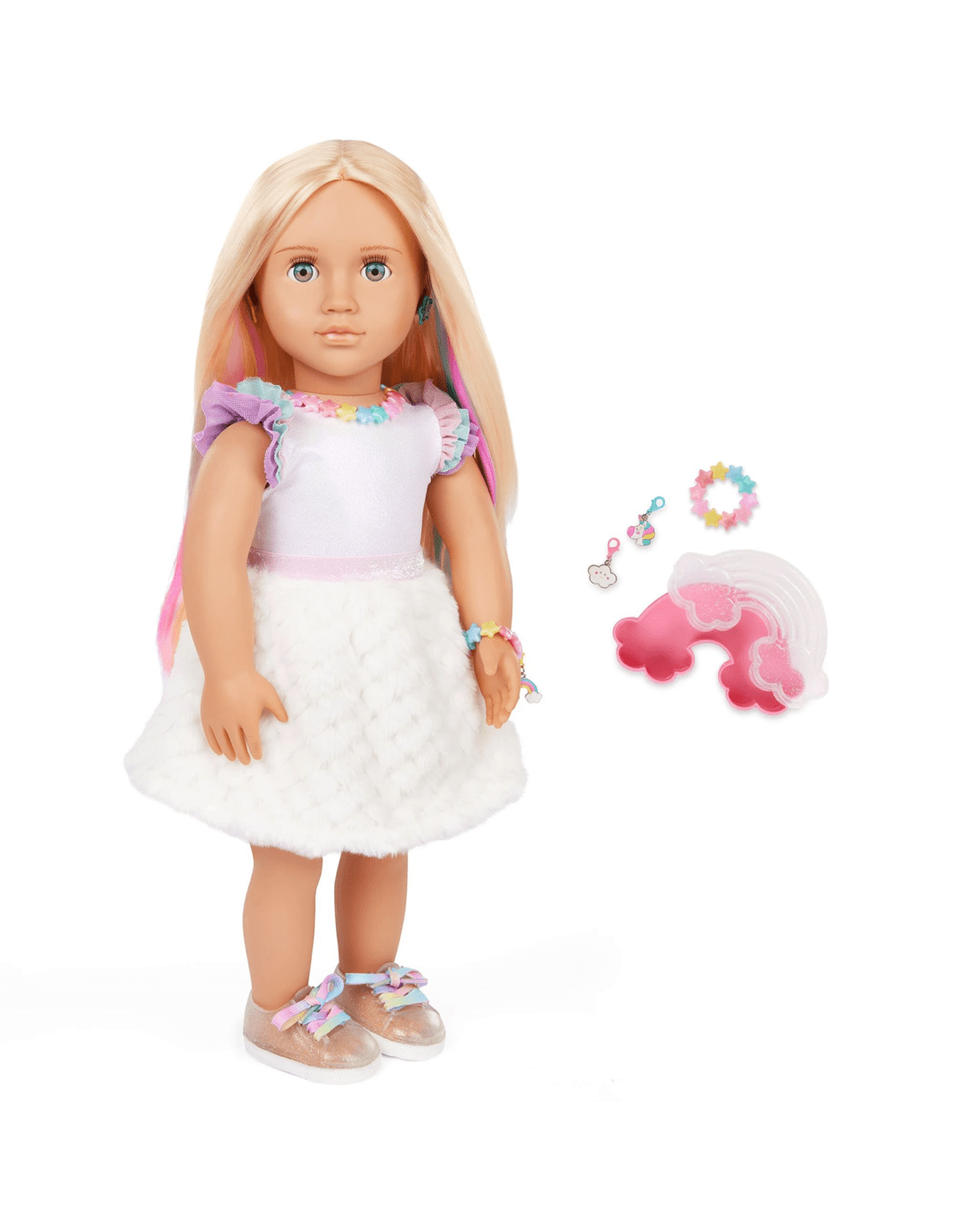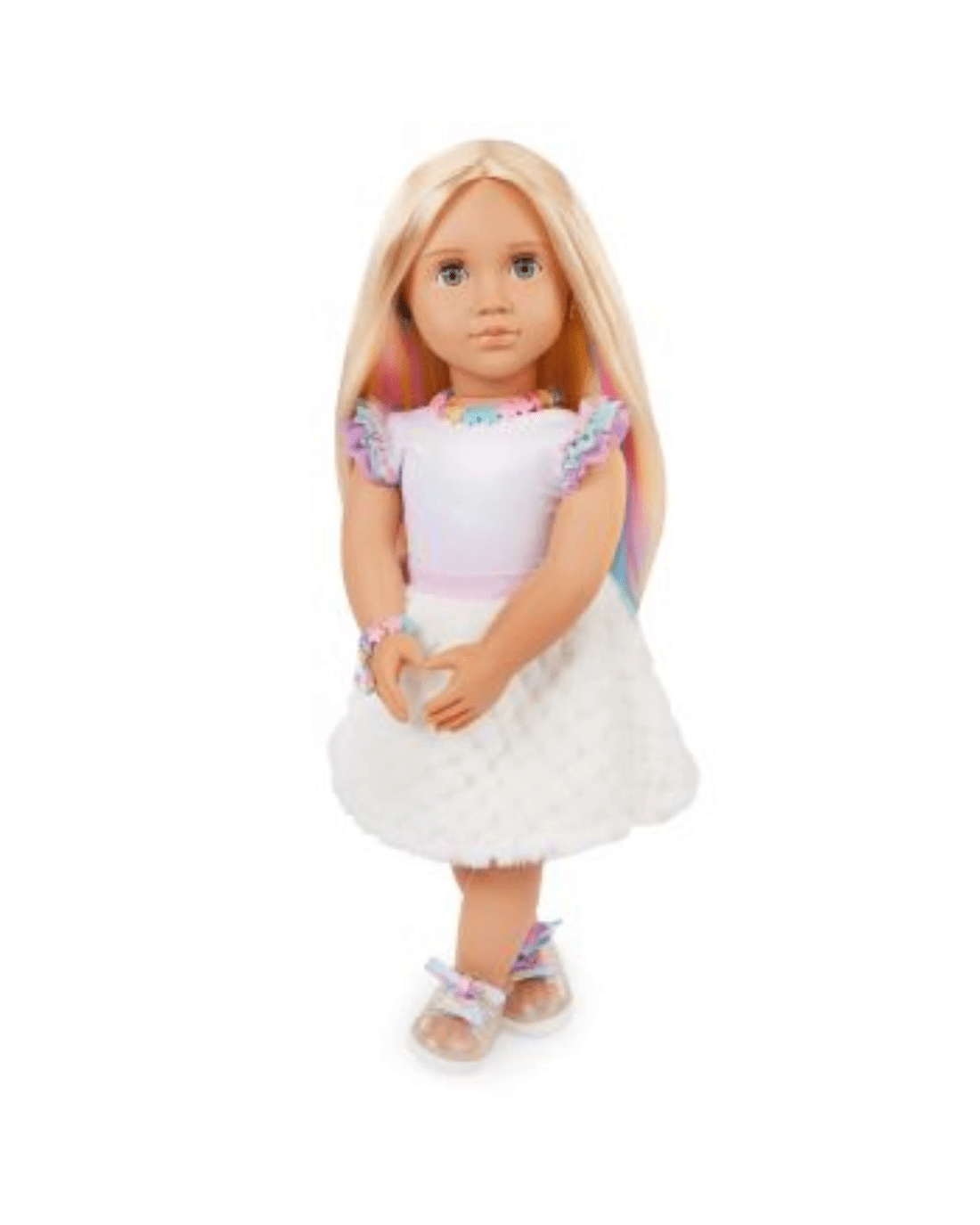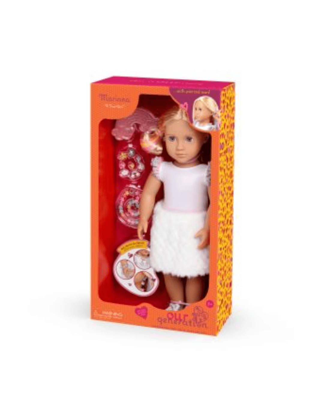 Bring creativity to life and make every playtime magical with the Our Generation 18-inch Doll Mariana. Featuring a colourful collection of jewellery and three charming clip-on charms, Mariana inspires children to mix, match, and reveal their personal style. Her sparkling blue eyes open and close for real-life moments, and her soft, huggable body makes every adventure warm and cuddly. With long blonde locks highlighted by playful colours, styling her hair is a joy and her pierced ears allow for extra flair with earrings. Mariana arrives dressed in a delightful leotard, a snuggly faux-fur skirt, and standout shoes complete with rainbow laces. Kids will love how easily her outfits slip on and off, inviting endless dress-up fun while encouraging imaginative stories. Start your next adventure and let Mariana be your fashion muse.Features