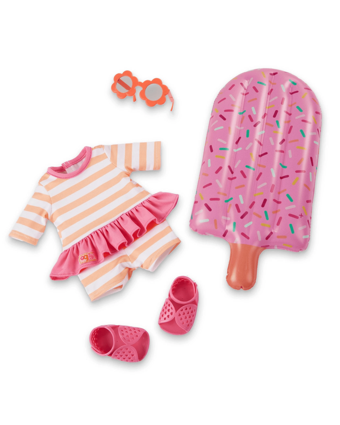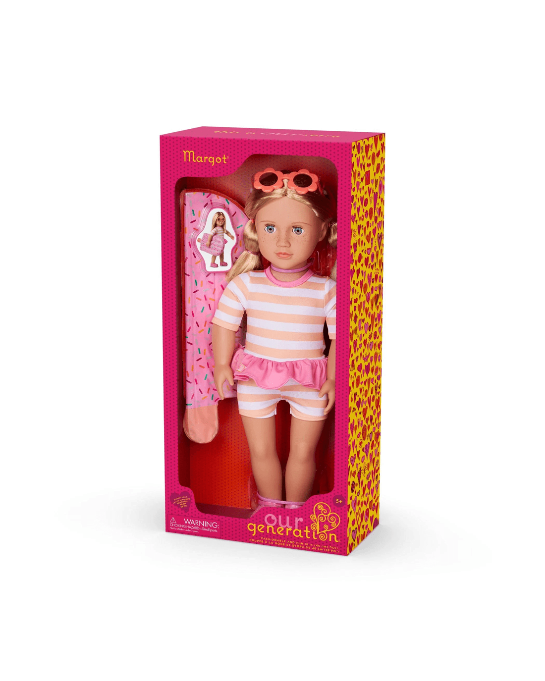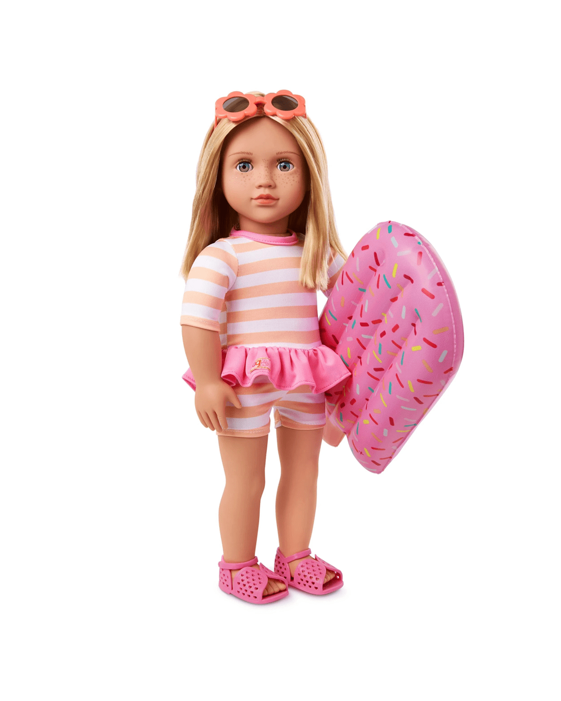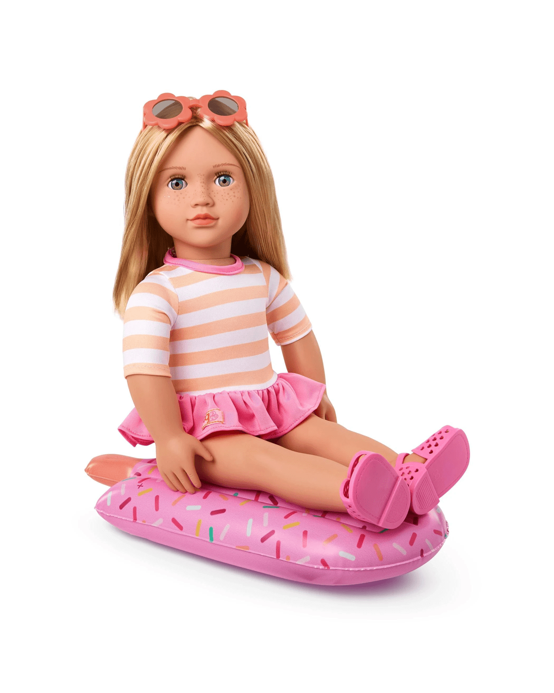- Child friendly fashion: Margot wears a sporty swimsuit with cute stripes and a pink frilly waist, floral sunglasses and peeptoe sandals. She also comes with a popsicle themed pool float that kids can really inflate!