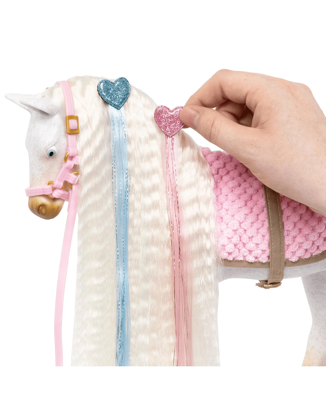 - Includes toy horse, blanket, bridle, 2 x heartclipped hair extensions and 6 x hair elastics and hair brush