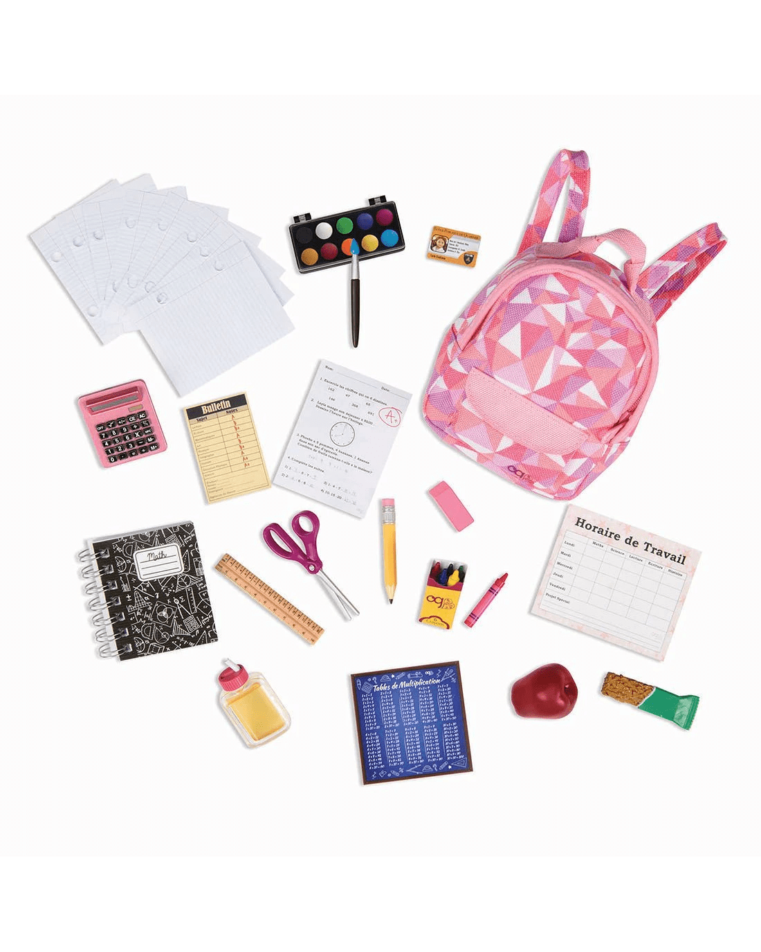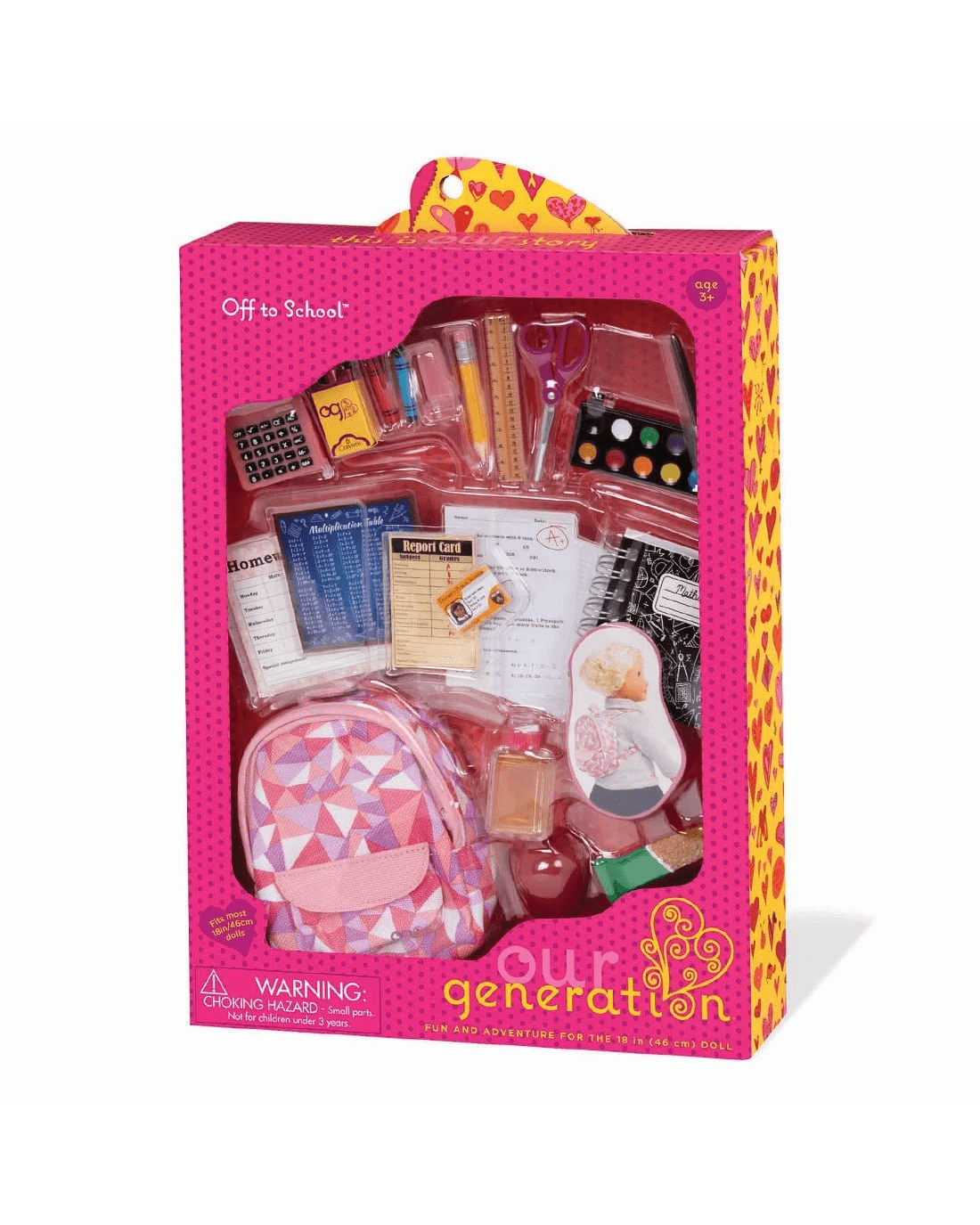 Make back-to-school adventures exciting for your little one's 18-inch dolls with this cheerful accessory set. Packed inside a stylish pink backpack with a delightful geometric pattern, you’ll find everything your doll needs for a fantastic school day. With essentials like notebooks, writing tools, a student card, and more, your doll will be ready to tackle every subject from reading to science in style. The handy storage compartments ensure everything stays organised, adding an extra touch of fun to playtime. Give your child the chance to create imaginative classroom stories and encourage friendship and learning through play. Dive into days full of discovery and let your doll be top of the class – grab this accessory set now and set off for school fun together!